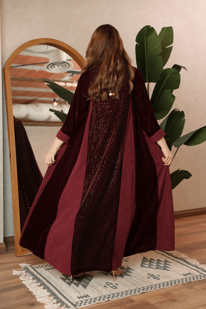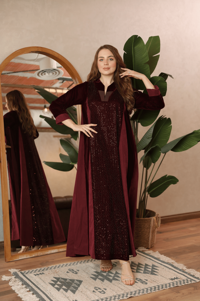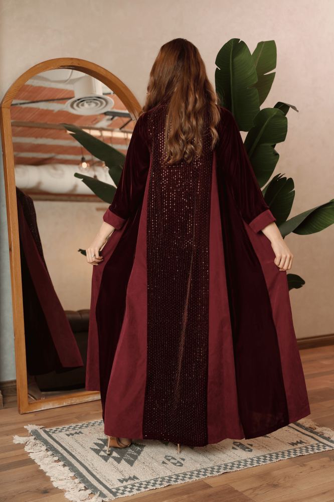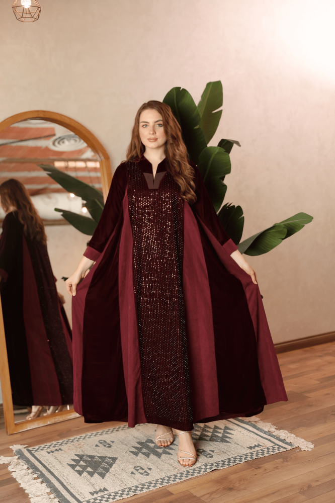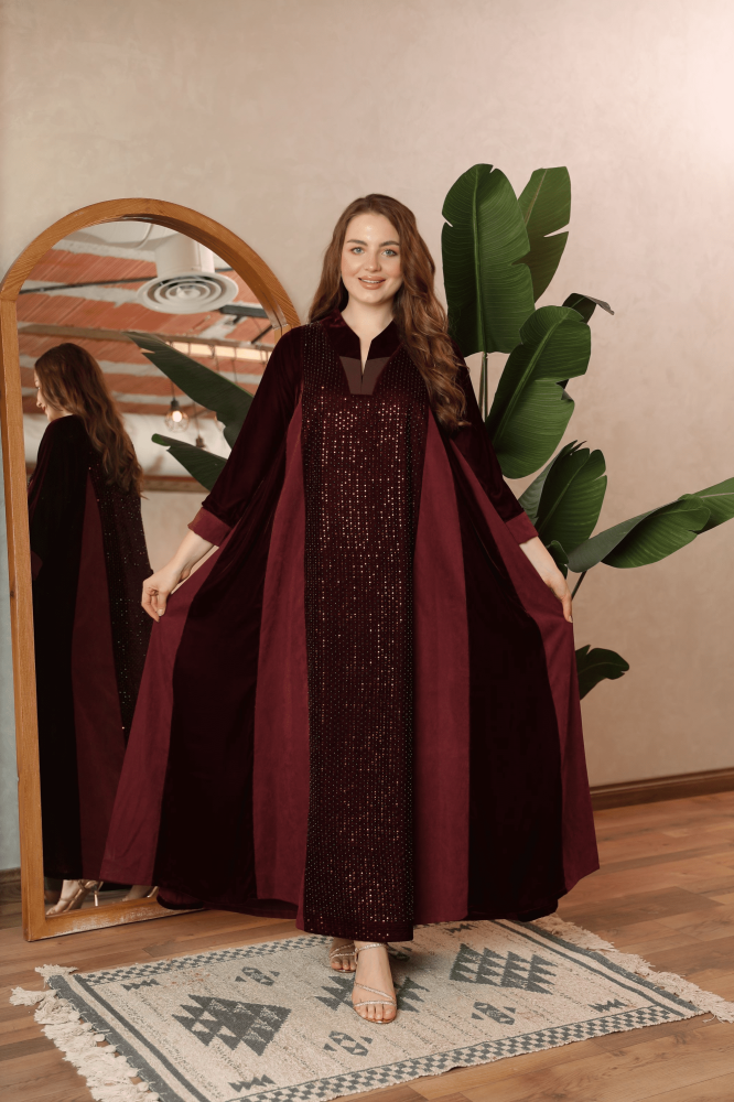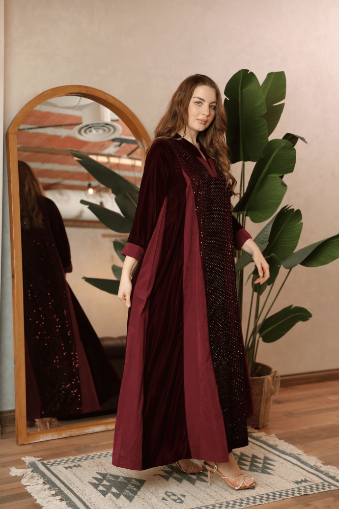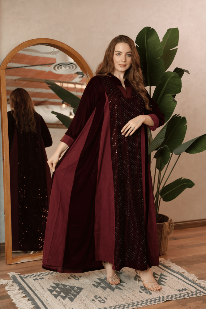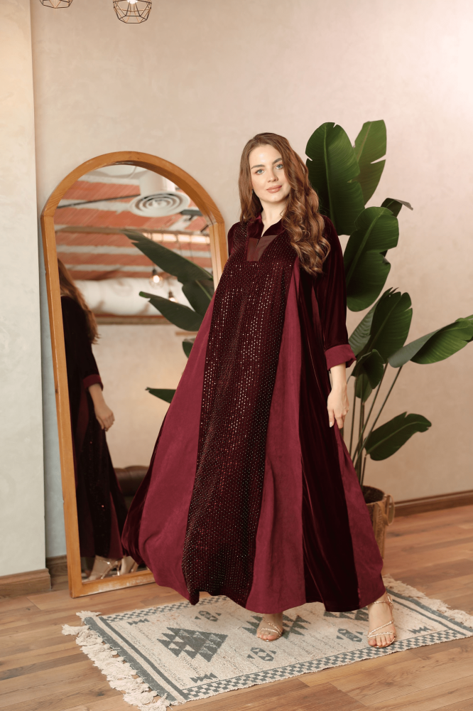 جلابية مخمل بشك راقي +حرير مغسول _قصه كلوش / اللون عنابي
