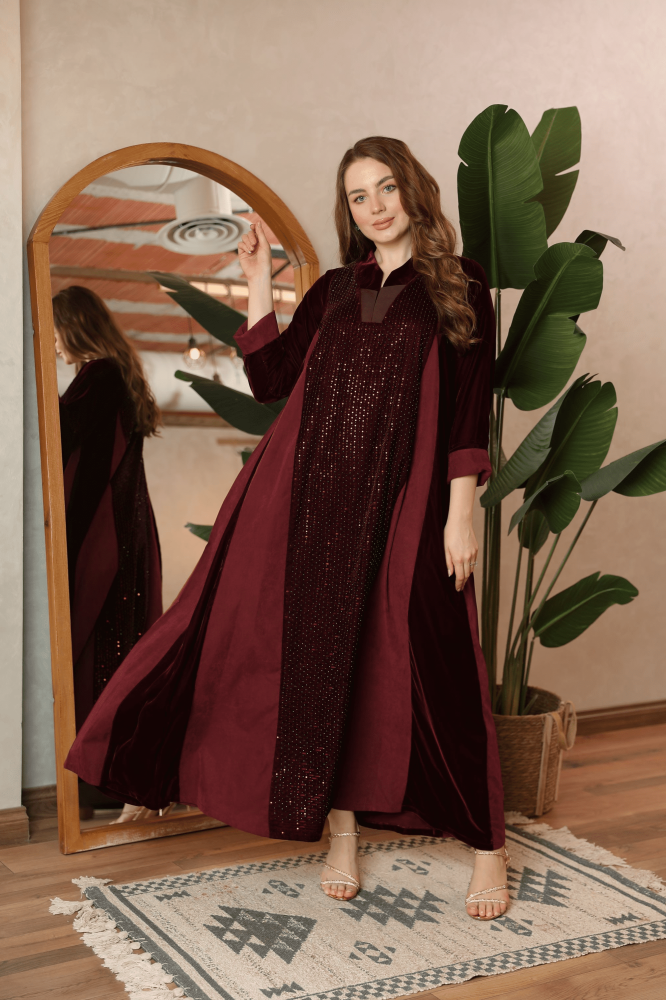 جلابية مخمل شك +حرير مغسول _اللون عنابي