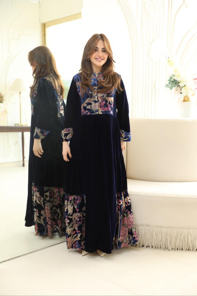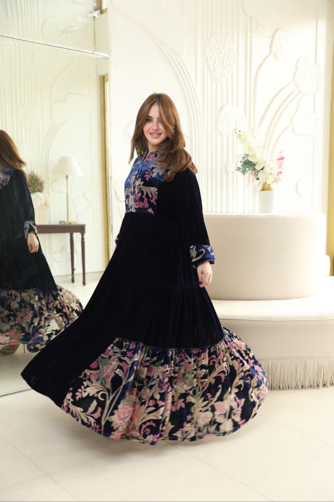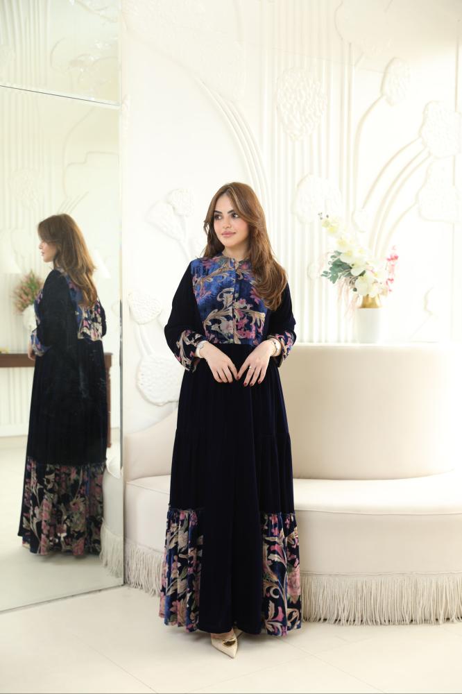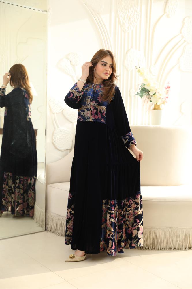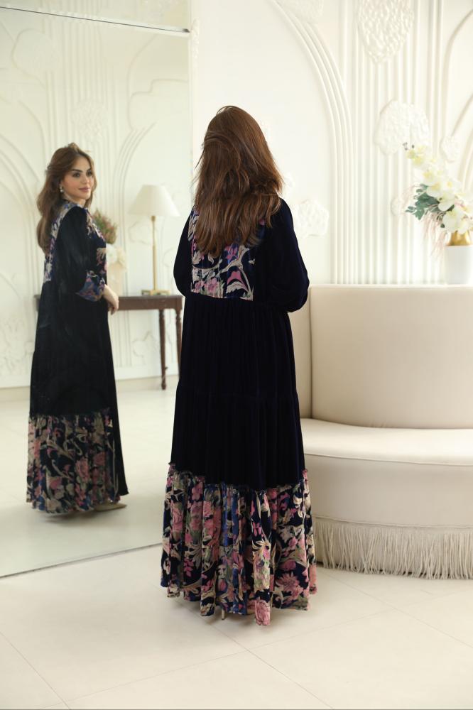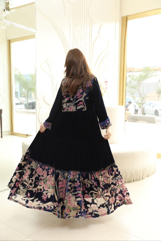جلابية مناسبات لاطلاله راقيه بمكس خامات مخمل مشجر بلون كحلي بقصة طبقات فلووي