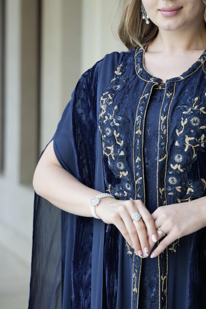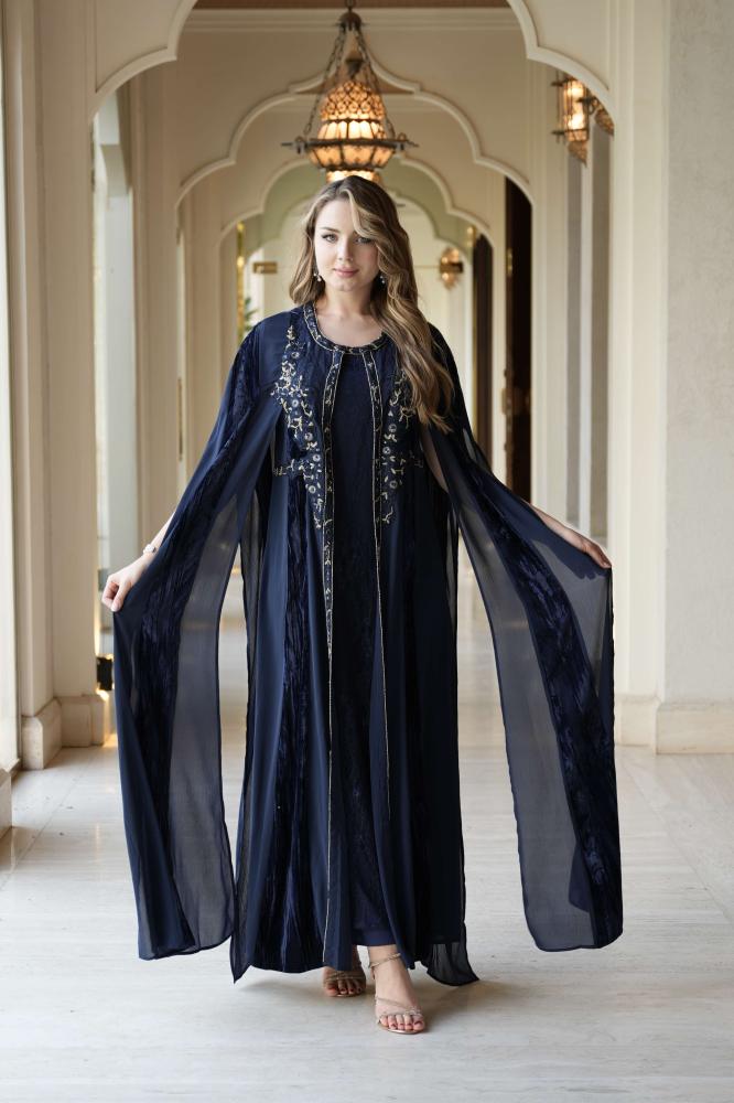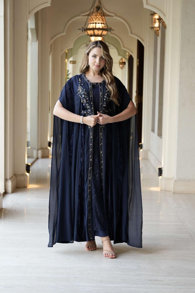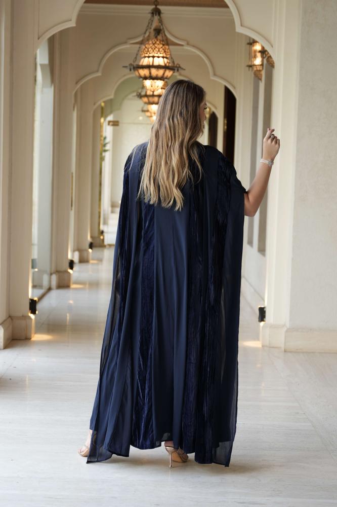 تمتعي بالفخامة والأناقة مع جلابيه صممت من أفخم أنواع الأقمشة - مخمل و شيفون فاخر - بلون كحلي لإطلالة راقية و ناعمة. مصممة لتجعلك تشعرين وكأنك ملكة في كل مرة ترتدينها.