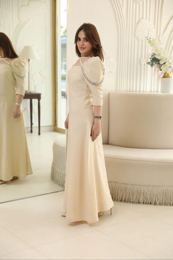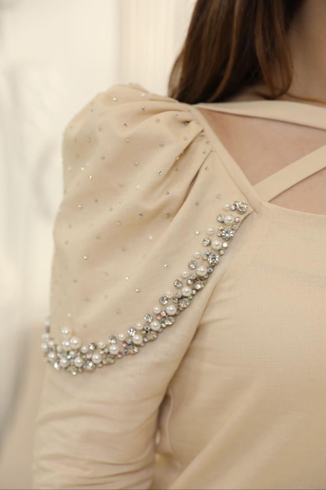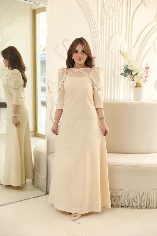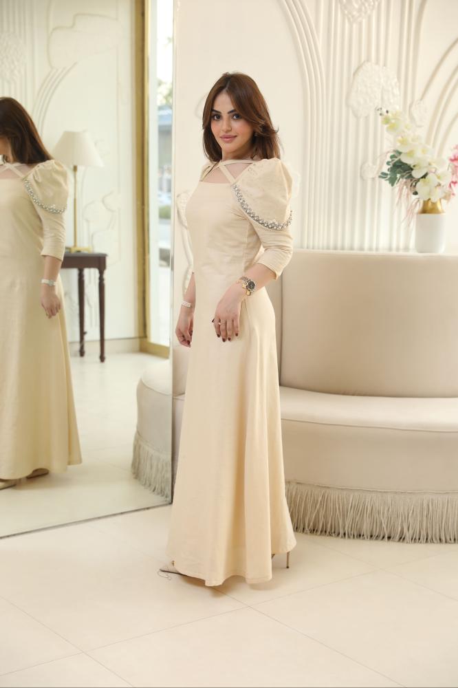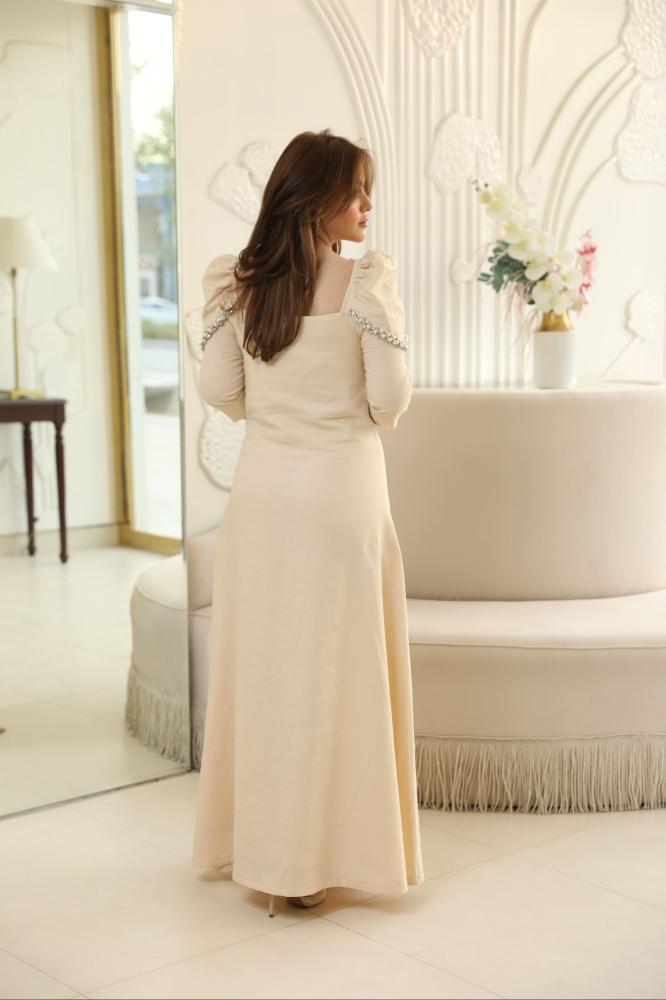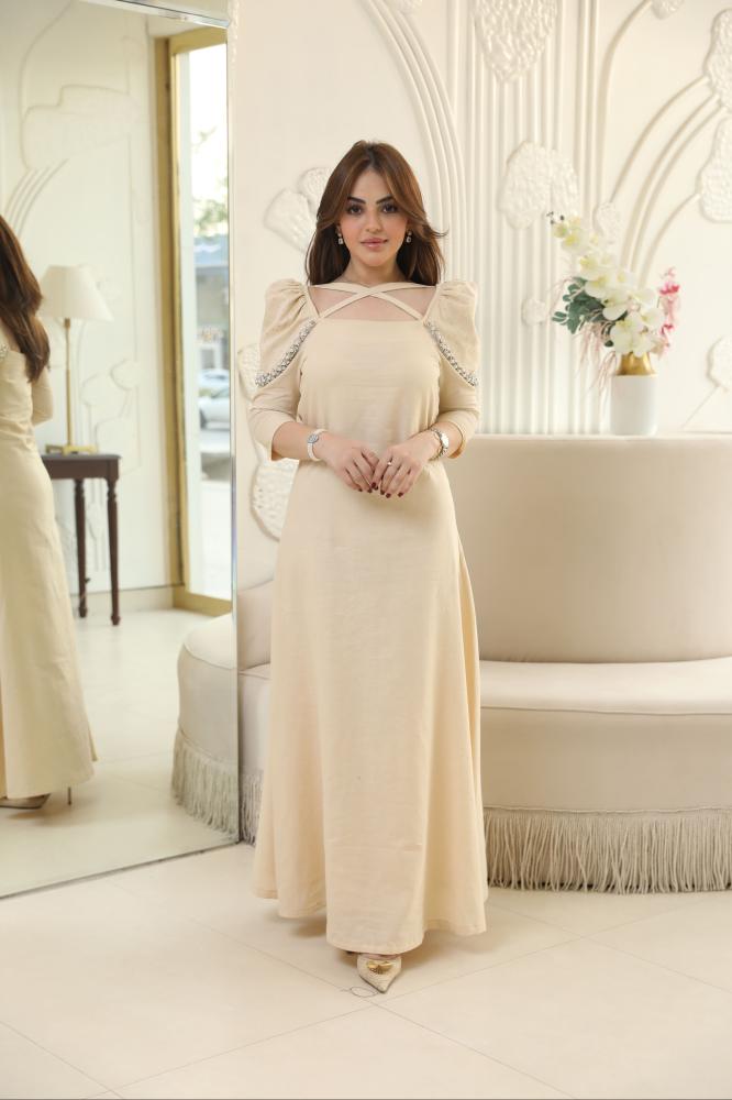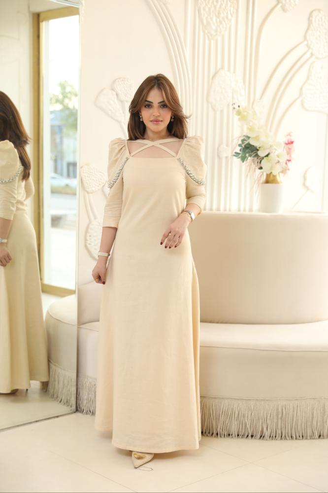 جلابية مناسبات لاطلاله عصريه بخامة لينن بيور إيطالي بلون بيج كلاسيك بتصميم أكمام بف مشغول شك يدوي ناعم وأنيق