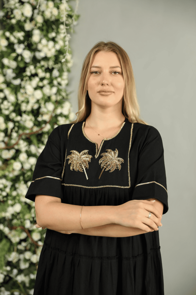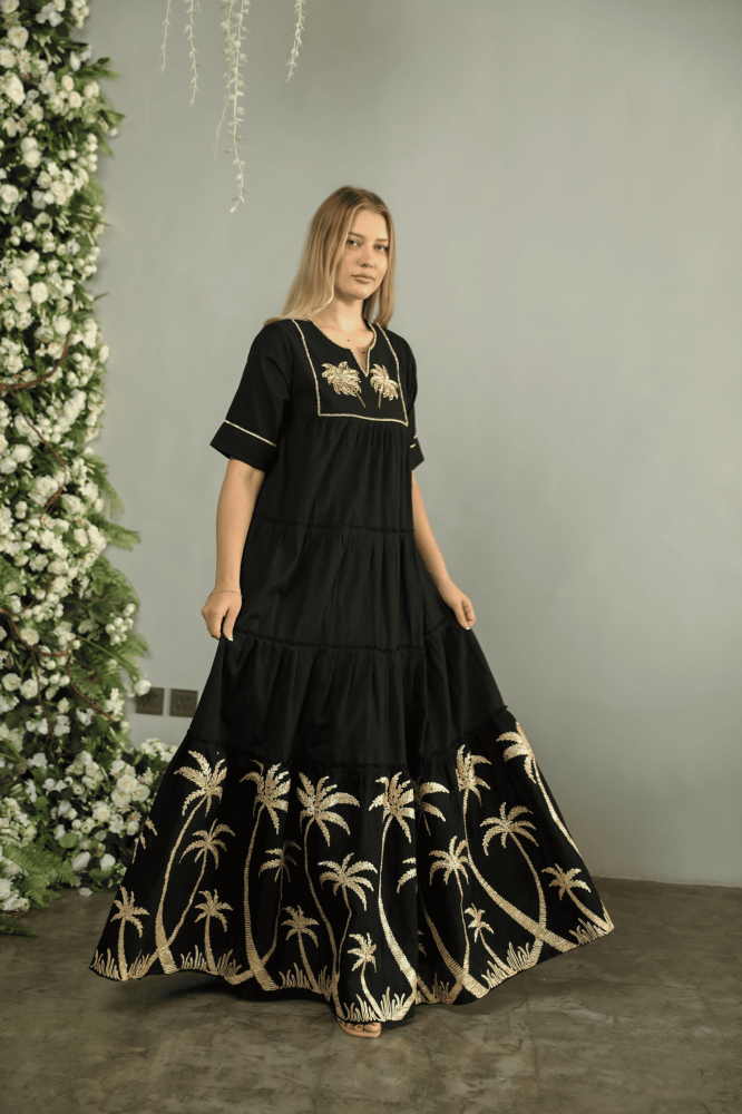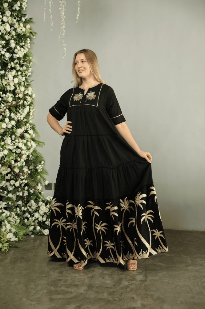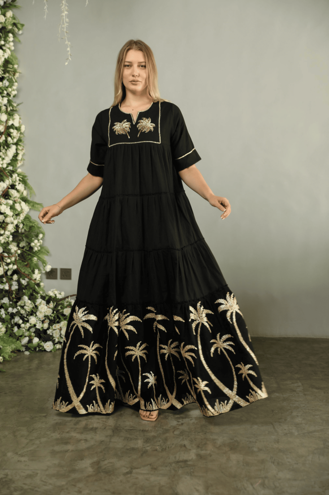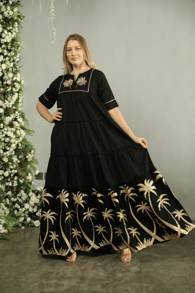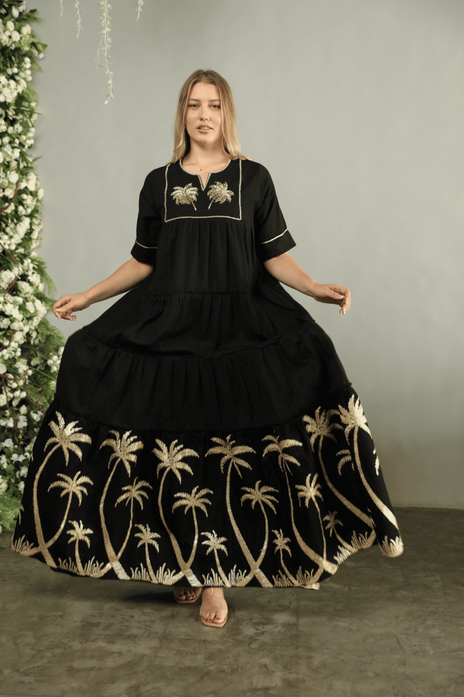 جلابيه بيور لينن لإطلالة جذابه بتصميم طبقات فلوي مشغول بشك يدوي ذهبي راقي وتطريز نخل باللون الأسود الملكي