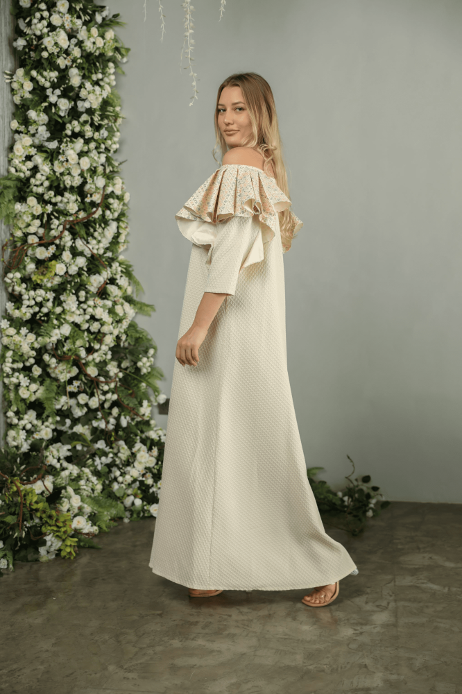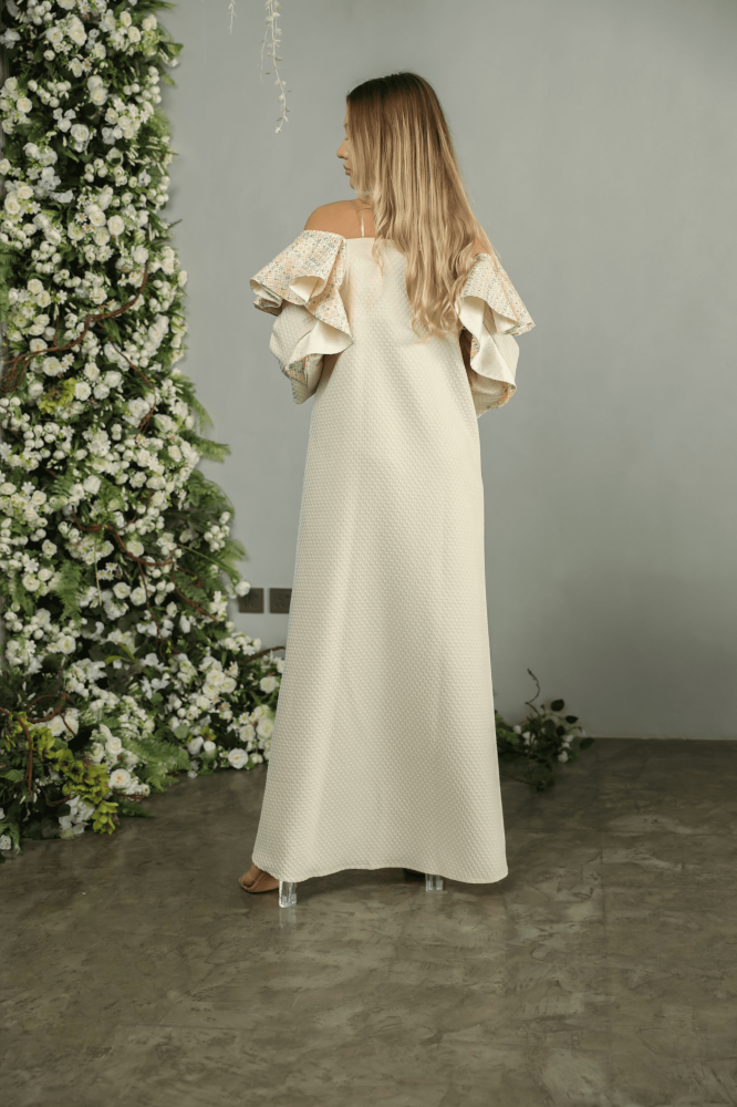 جلابيه لإطلالة جذابه بمكس خامات الجاكار والتفتا والفاخر بتصميم اكمام اوف شولدر مشغول شك وتطريز ناعم وراقي