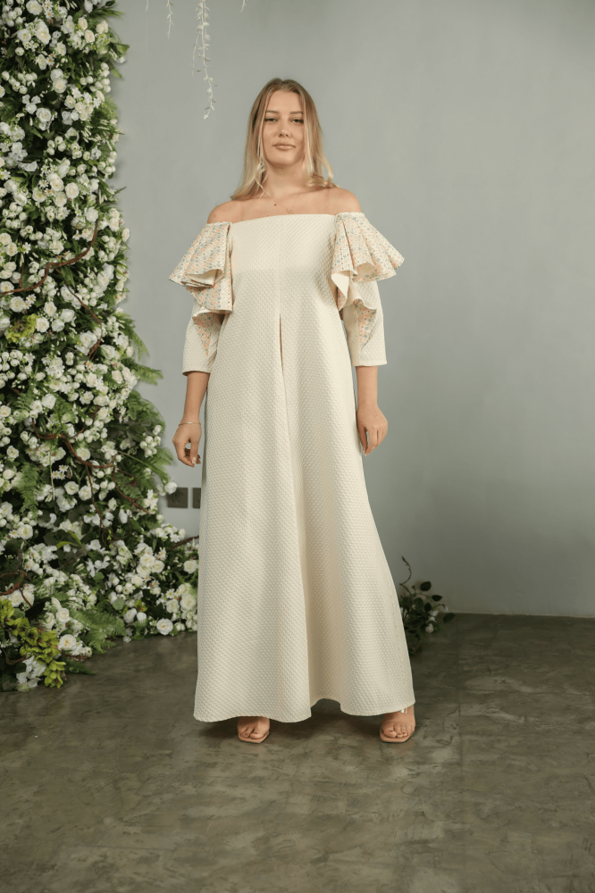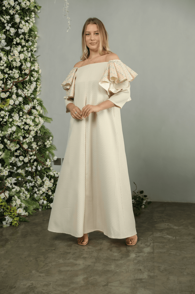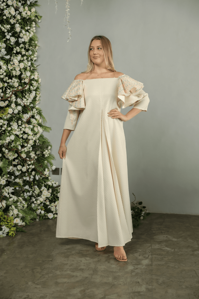 جلابيه لإطلالة جذابه بمكس خامات الجاكار والتفتا الفاخر الاكمام تلبس بطريقتين اوف شولدر او على الكتف مشغول شك وتطريز ناعم وراقي
