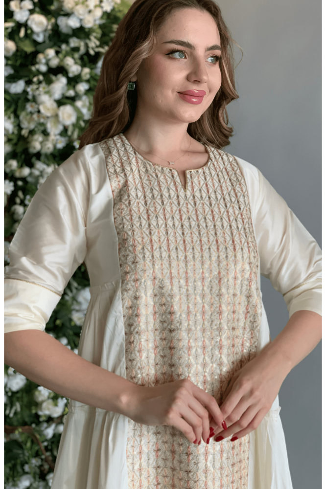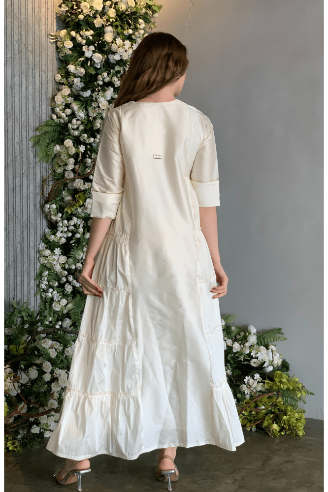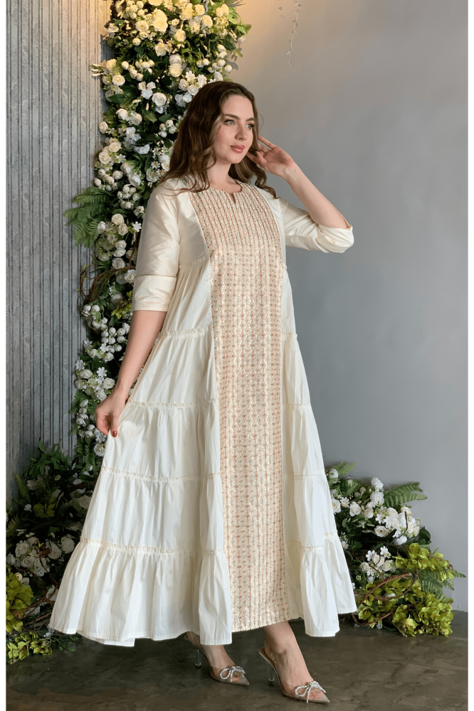 تمتعي بالفخامة والأناقة مع جلابيه من الطراز الرفيع صممت بإستعمال أرقى الأقمشة, ببخامة تفتا اوف وايت مشغول تطريز ناعم وبتصميم طبقات جانبيه وقصه كلوش فلووي - لإطلالة فخمة. مصممة لتجعلك تشعرين وكأنك ملكة في كل مرة ترتدينها.