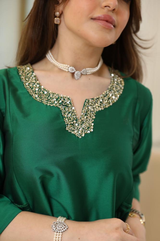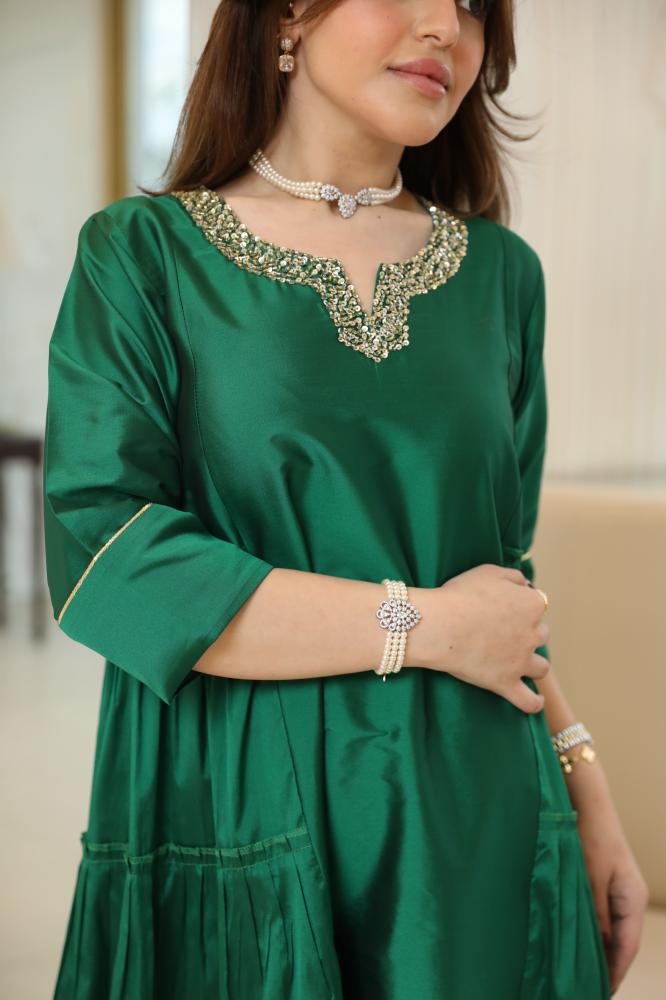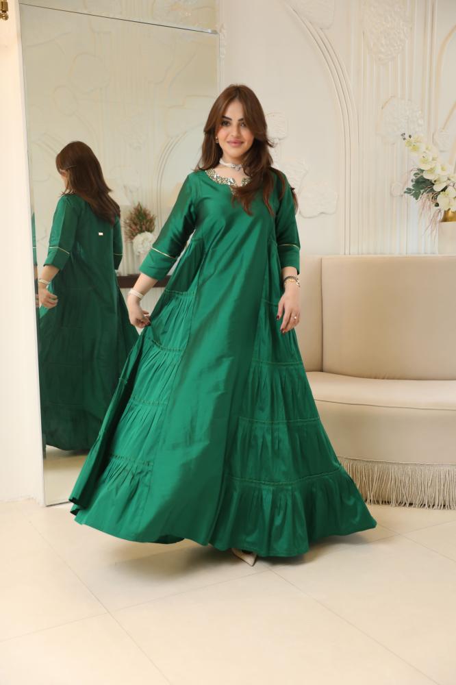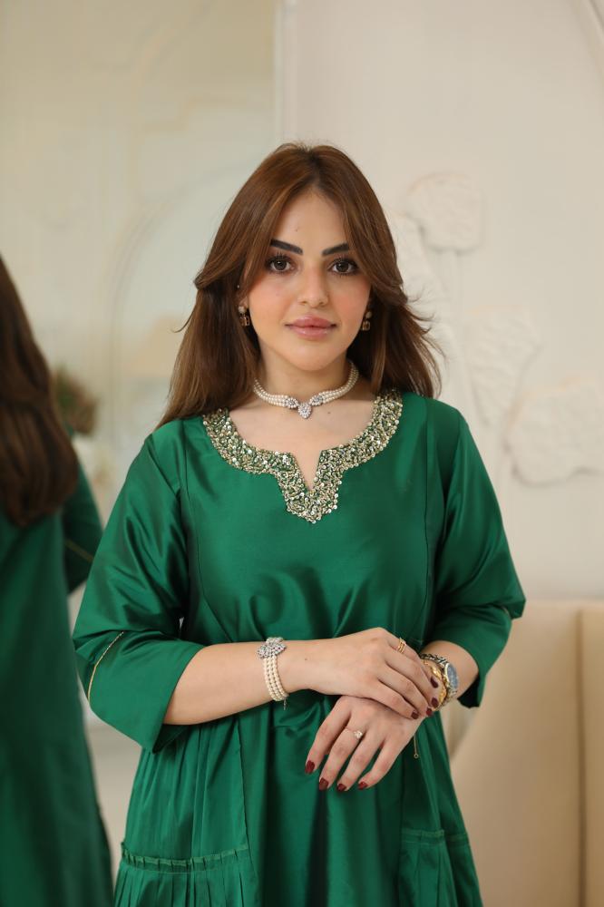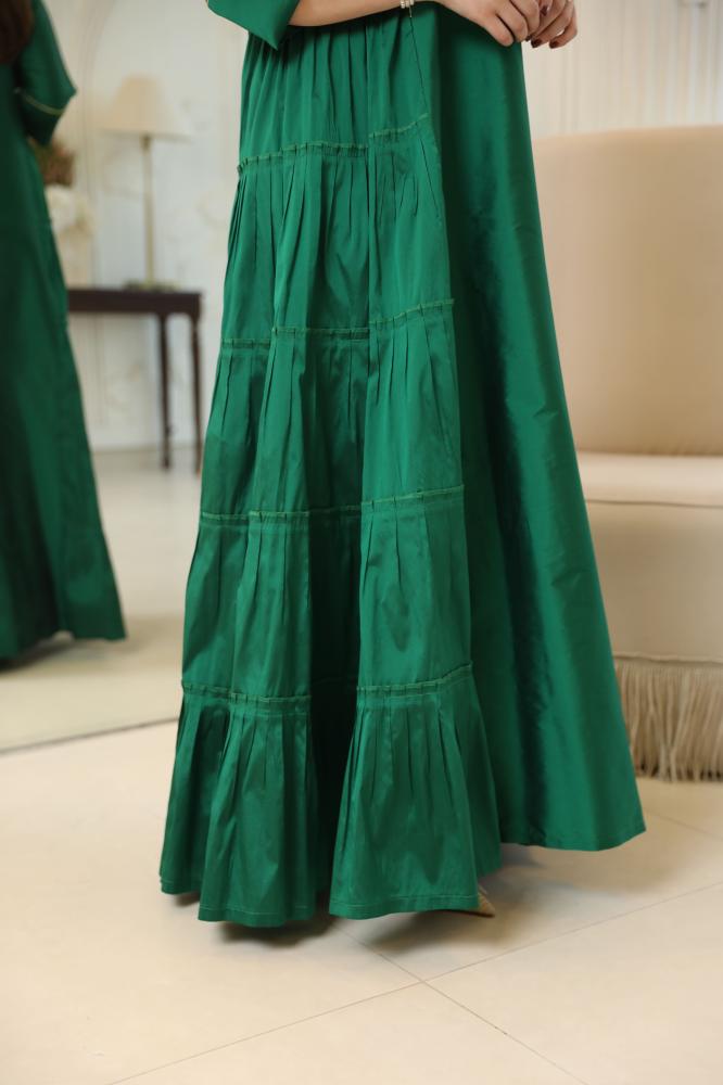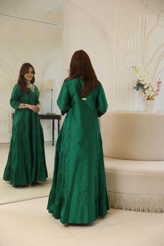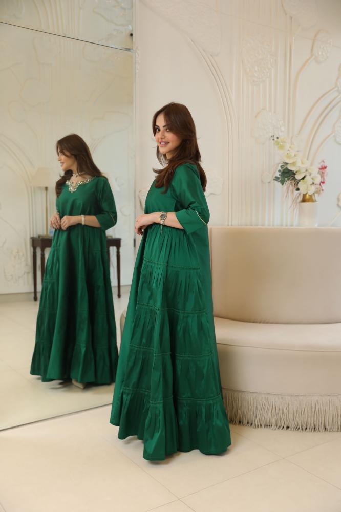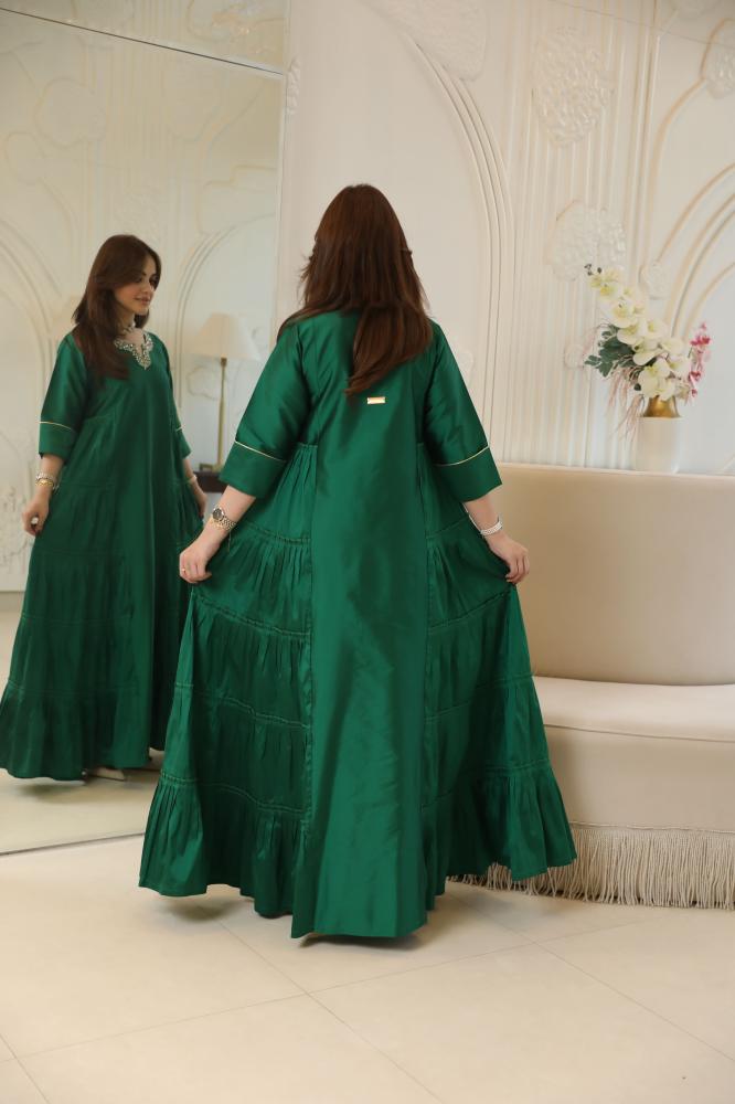 جلابيه لاطلاله جذابه بخامة تفتا بلون أخضر فاخره بتصميم طبقات فلووي مشغول شك يدوي ناعم وأنيق