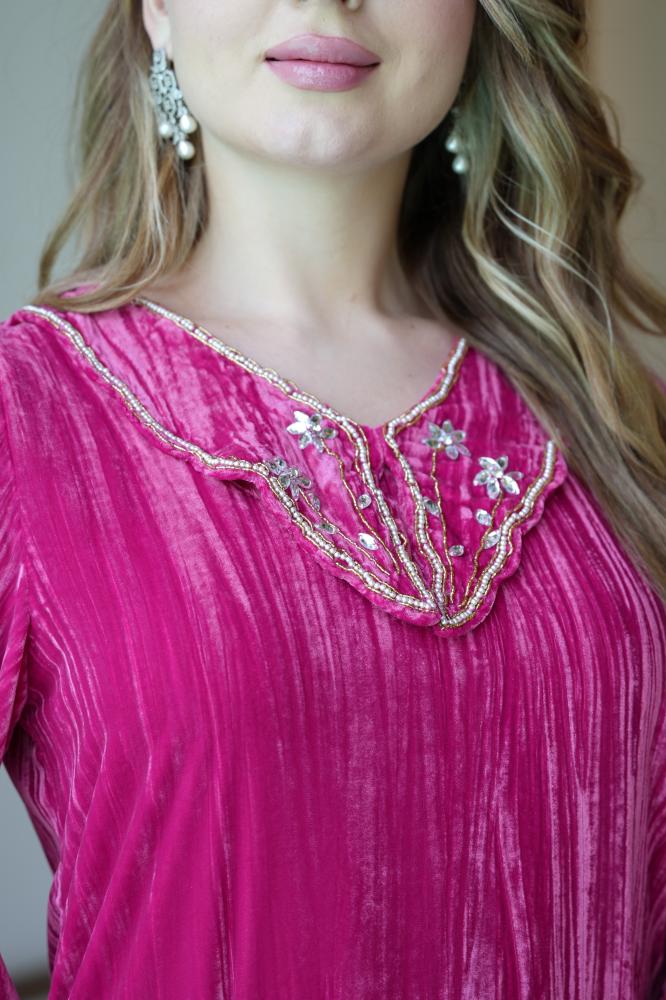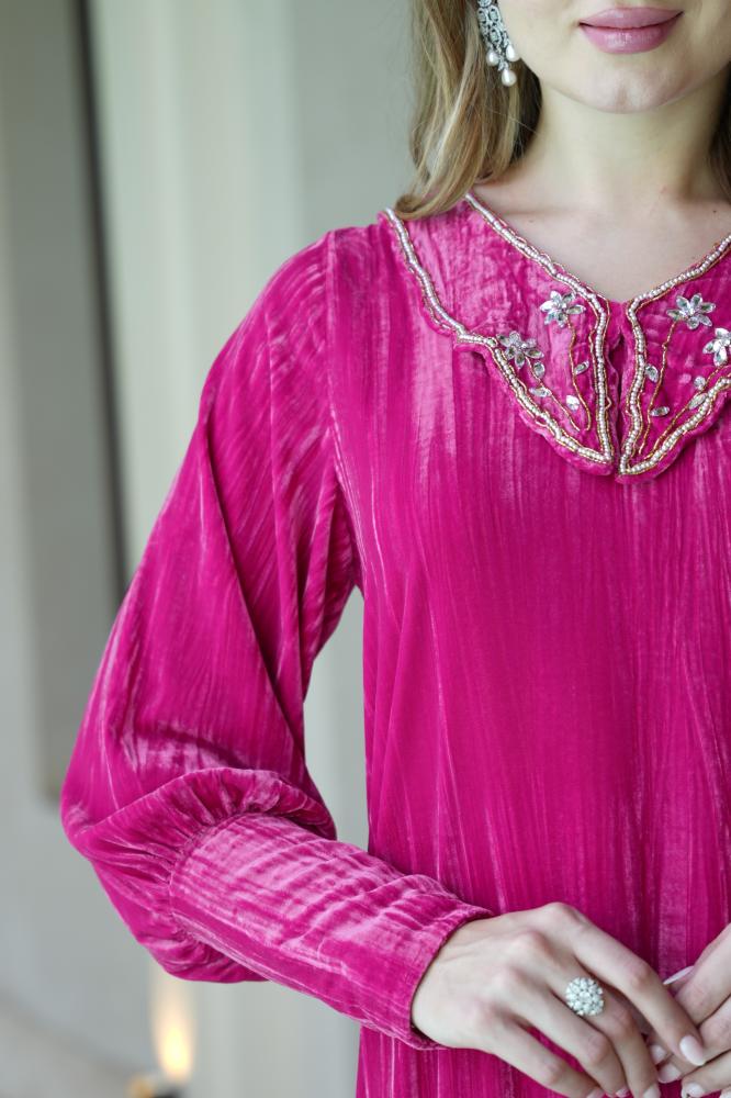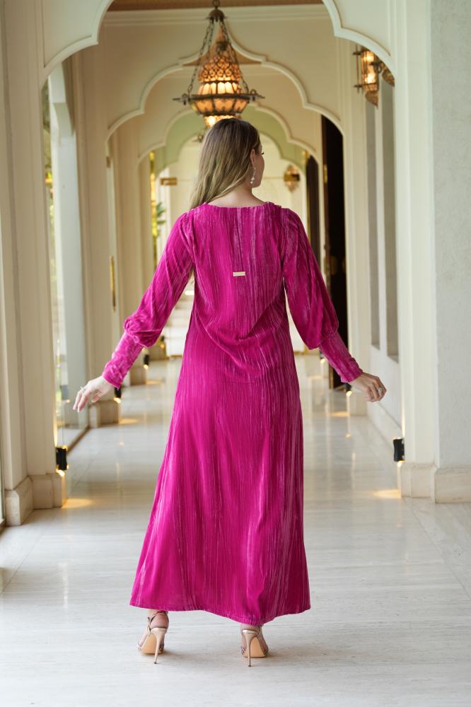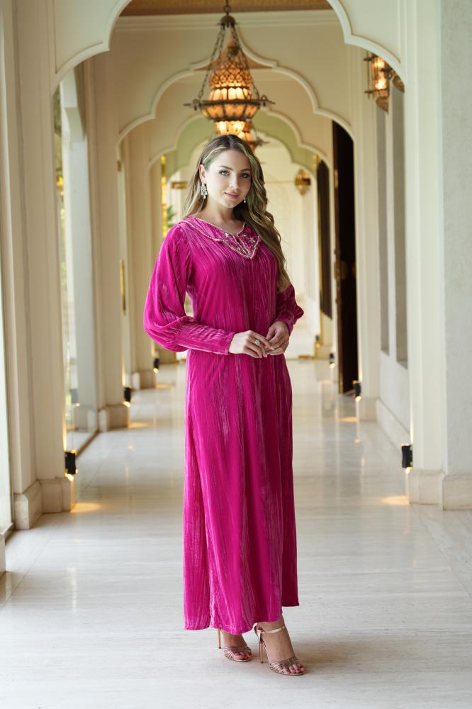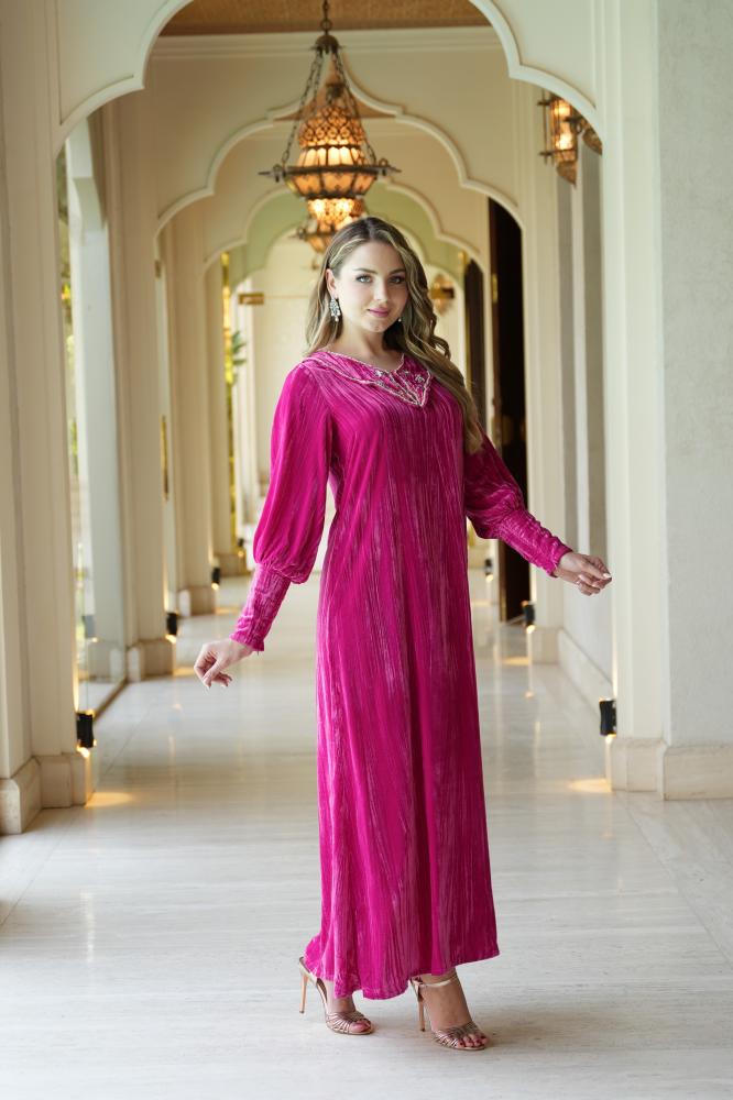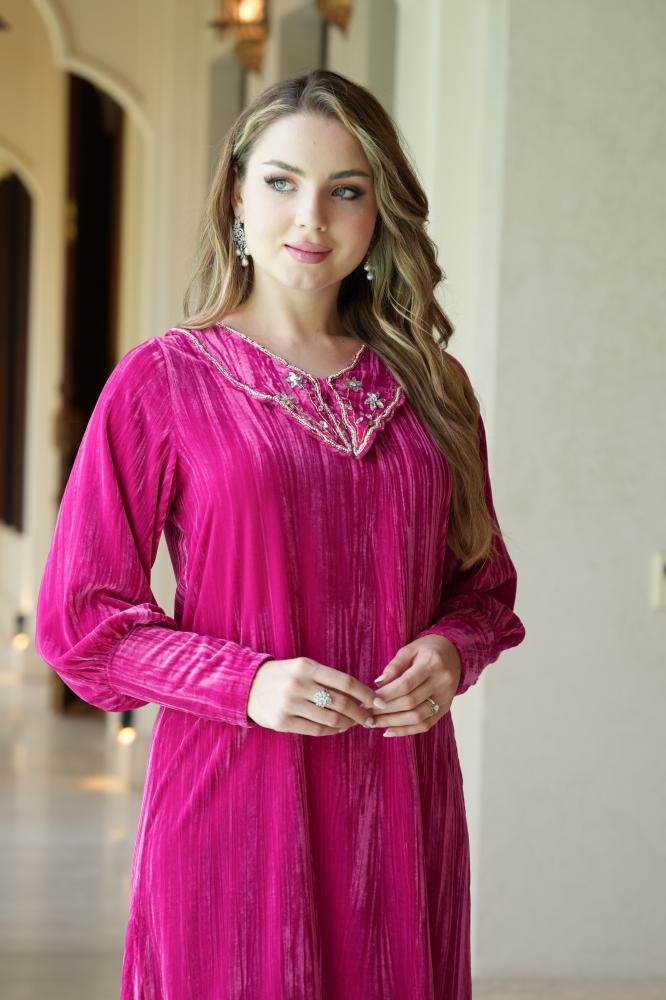 تمتعي بالفخامة والأناقة مع جلابيه صممت من أفخم أنواع الأقمشة - مخمل فاخر - بلون فوشي لإطلالة راقية و ناعمة. مصممة لتجعلك تشعرين وكأنك ملكة في كل مرة ترتدينها.
