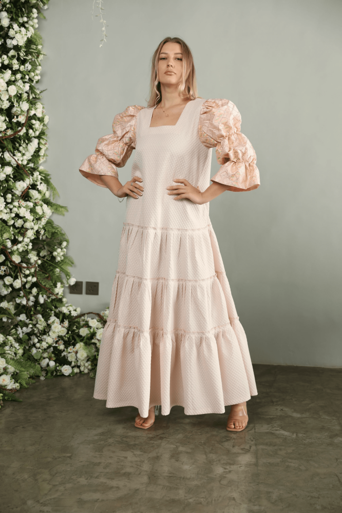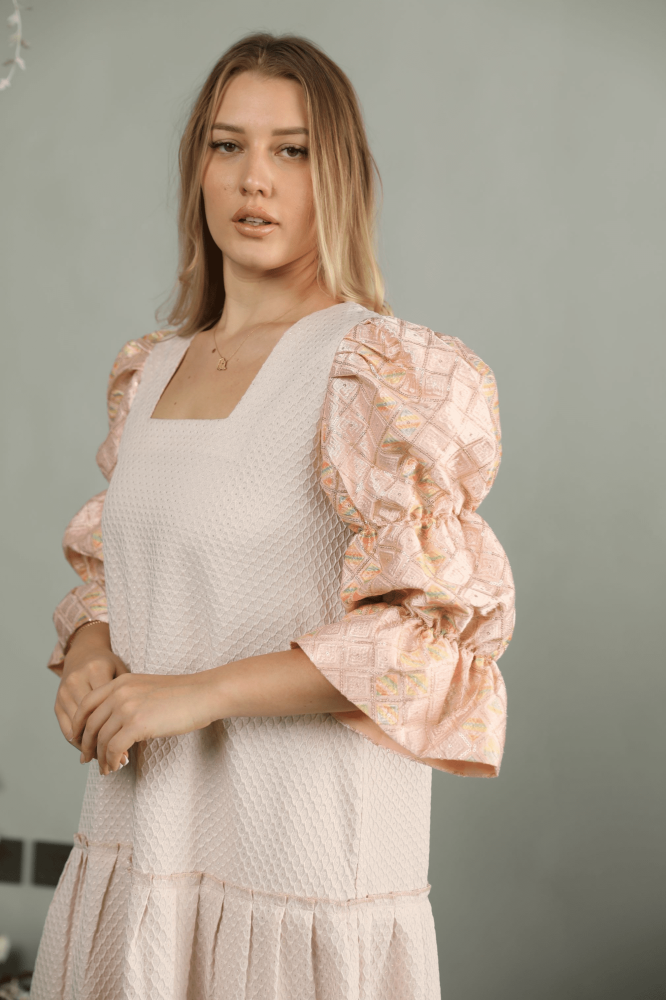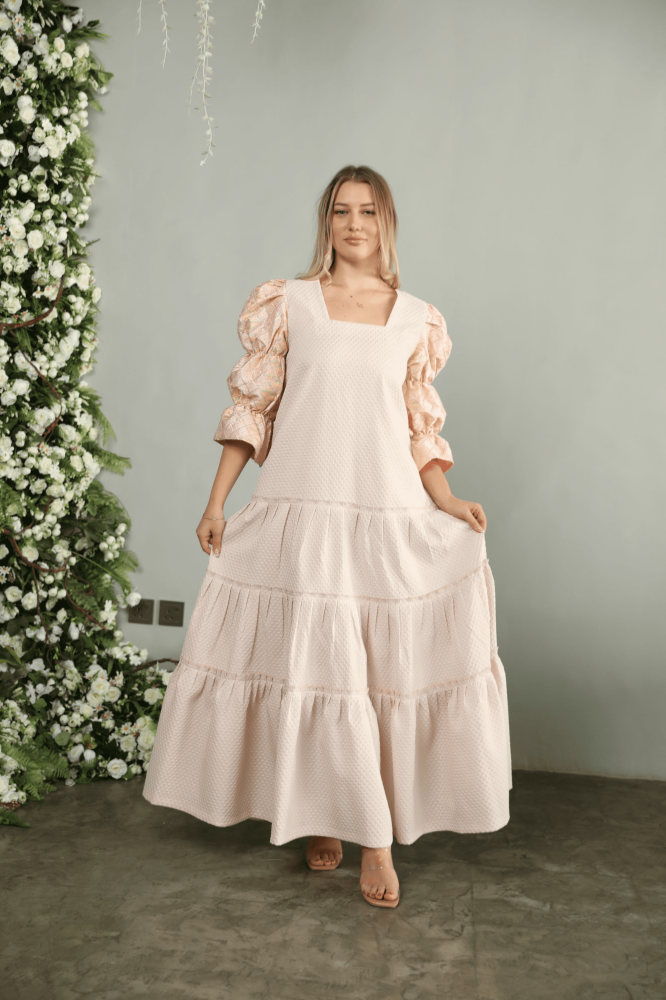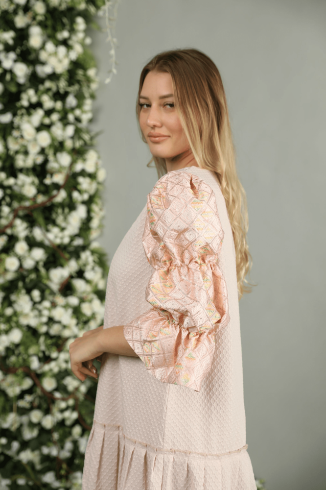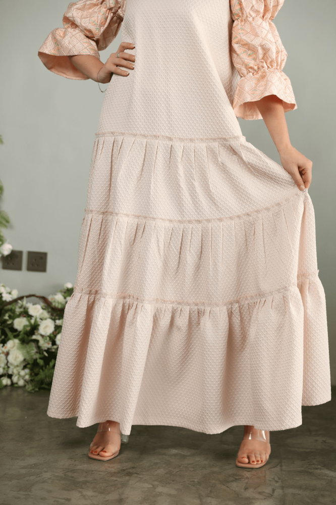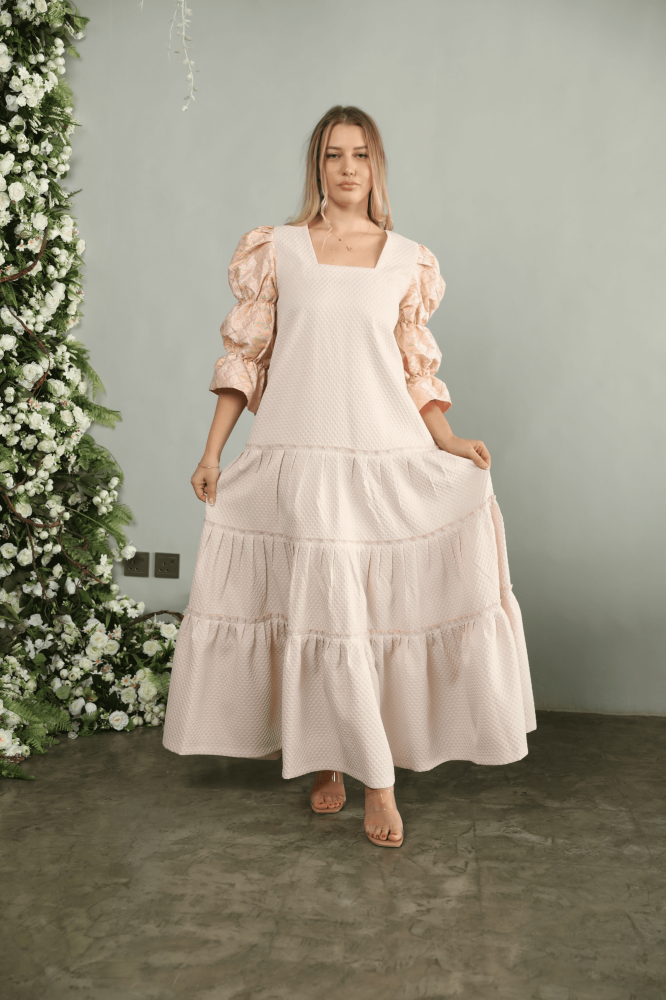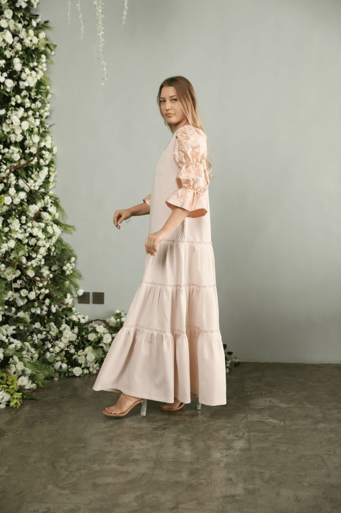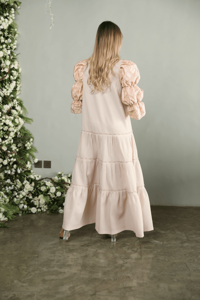 جلابيه لاطلاله جذابه بمكس خامات فاخره جاكار وتفتا تطريز وشك ناعم وأنيق بتصميم طبقات فلوي وأكمام منفوخه باللون الوردي