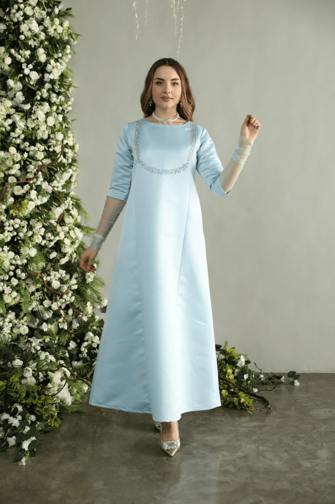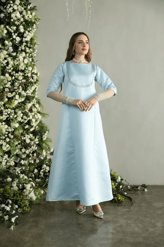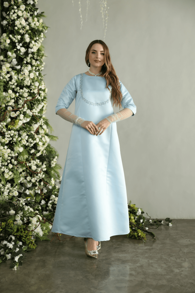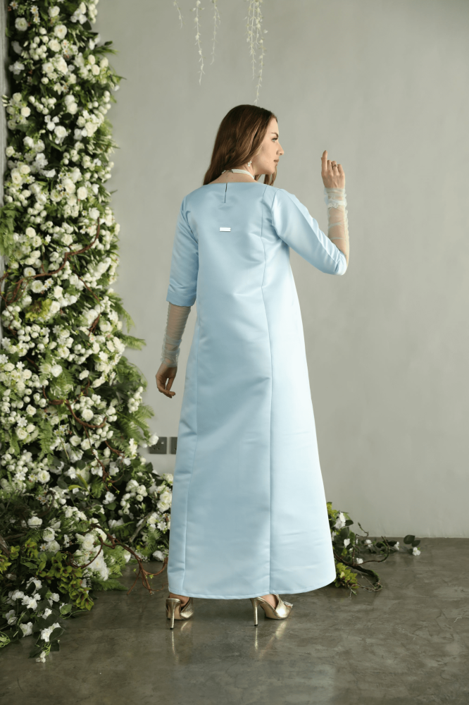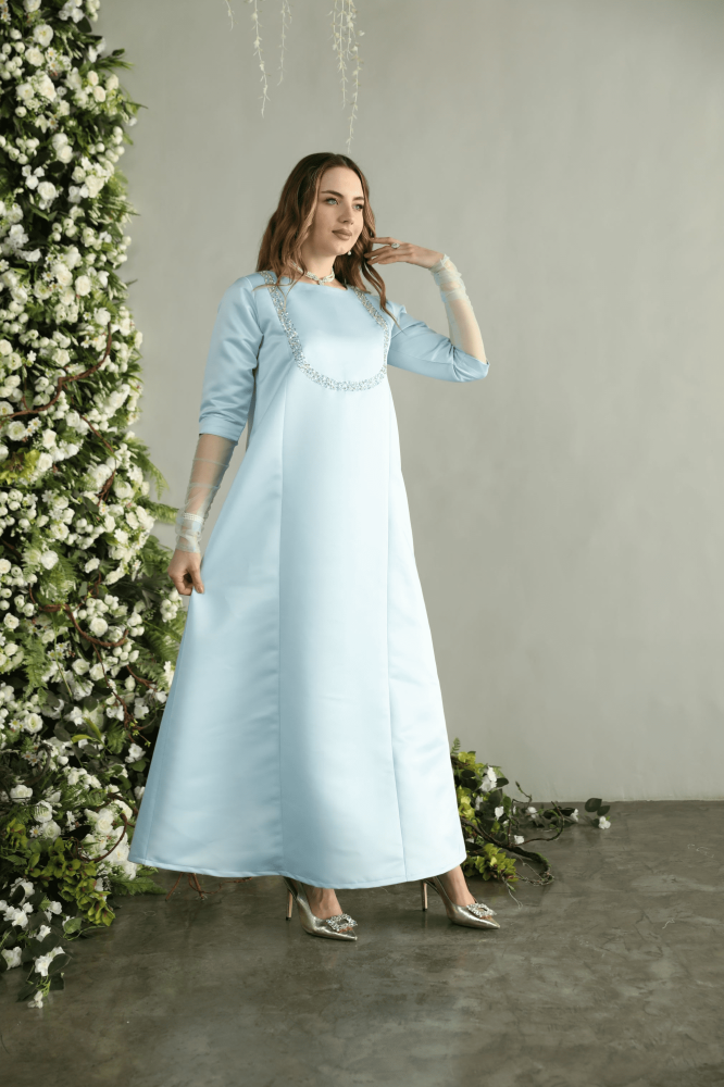 جلابيه لاطلاله راقيه بخامة تفتا فاخره باللون السماوي واكمام تول مشغول شك فضي ناعم وانيق