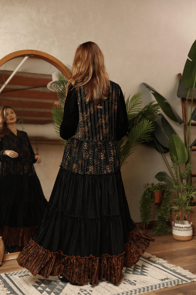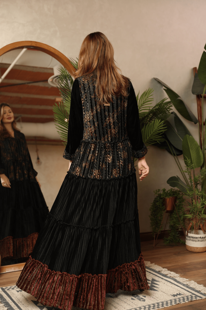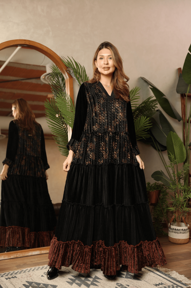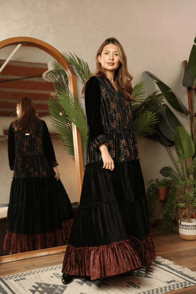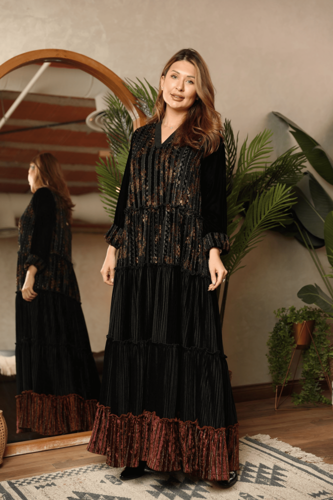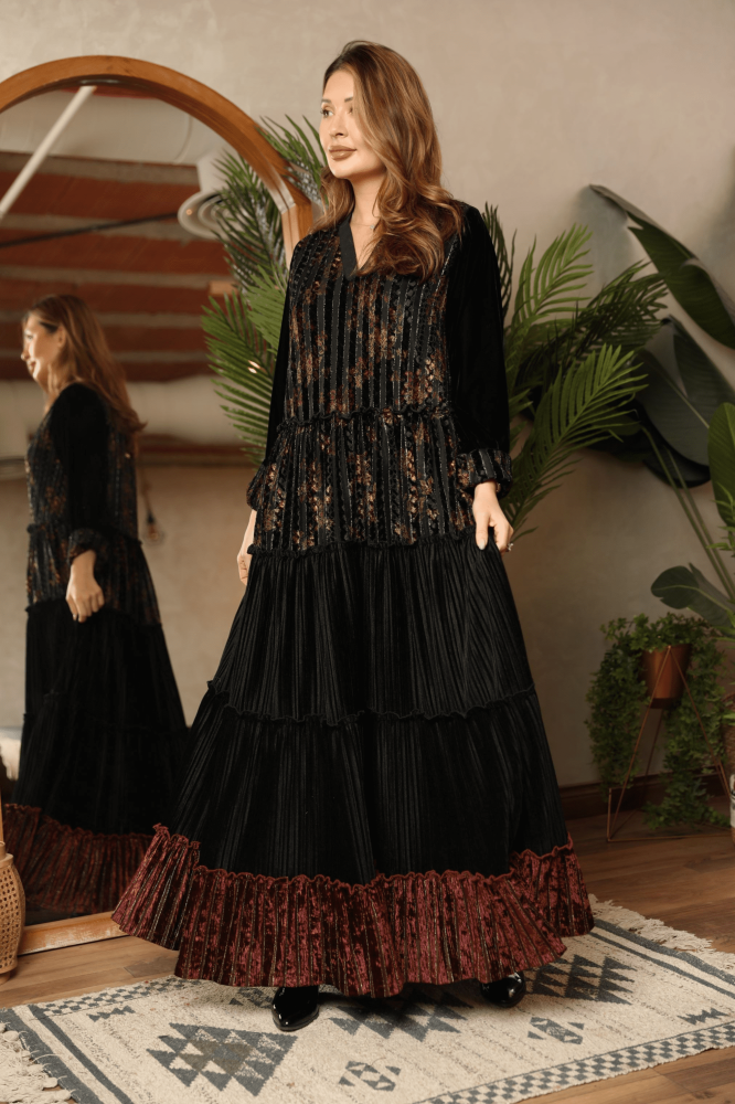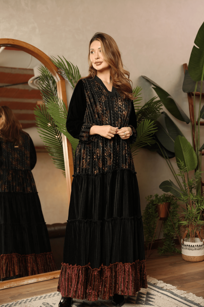 جلابيه مخمل مشجر طبقات /اسود+ عنابي