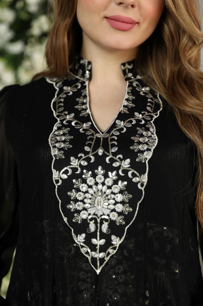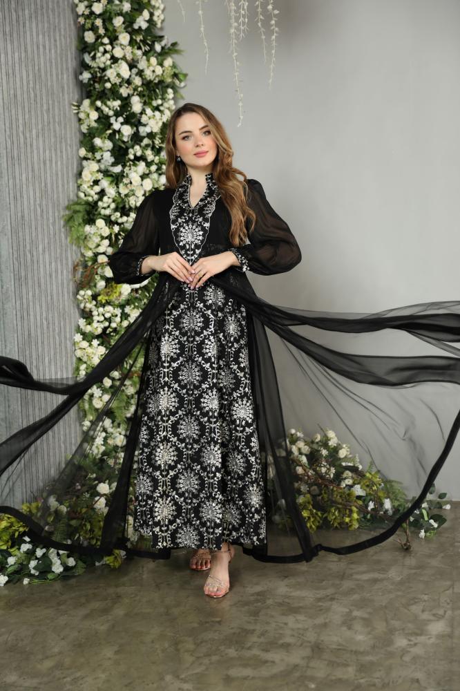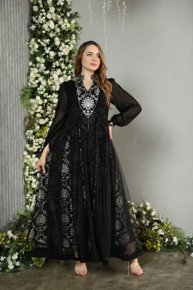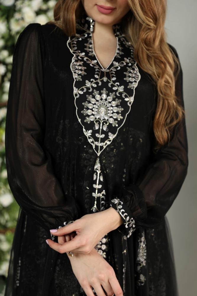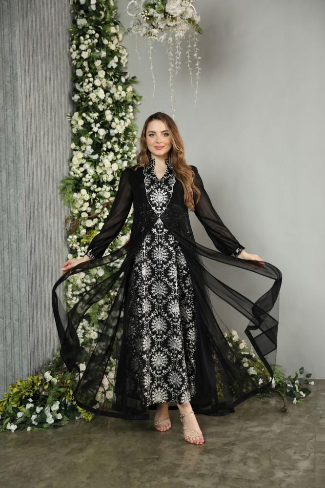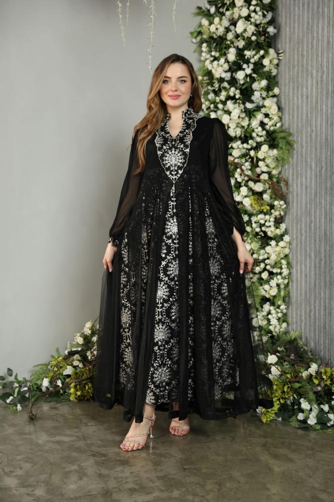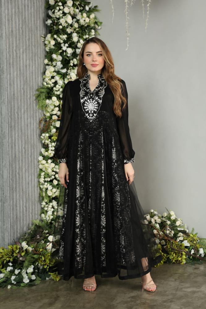 جلابيه مناسبات فخمة بمكس خامات فاخره شيفون و تول ولينن مشغول شك وتطريز راقي وانيق باللون الاسود الملكي