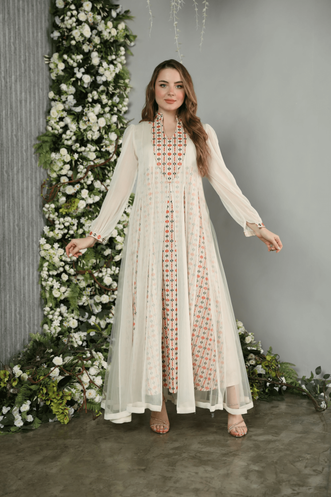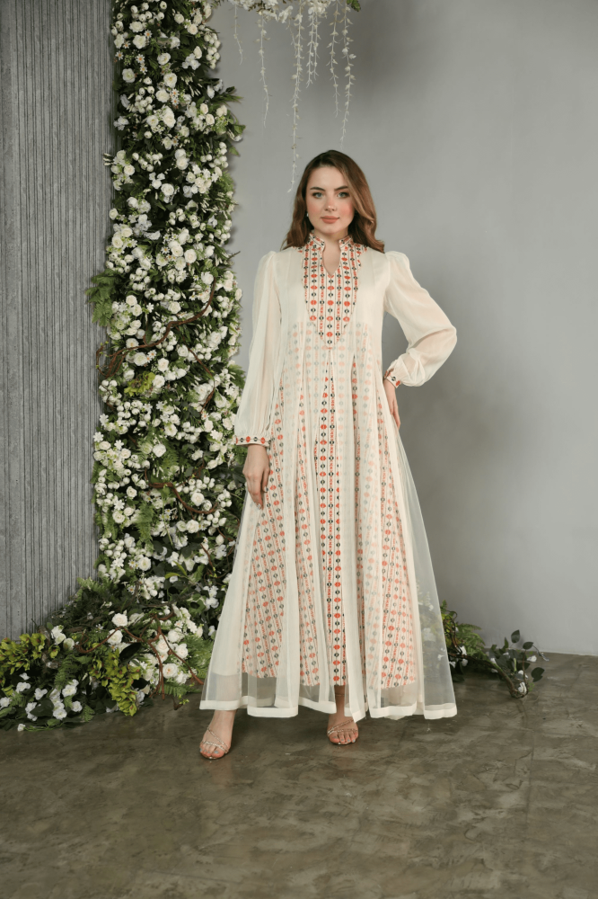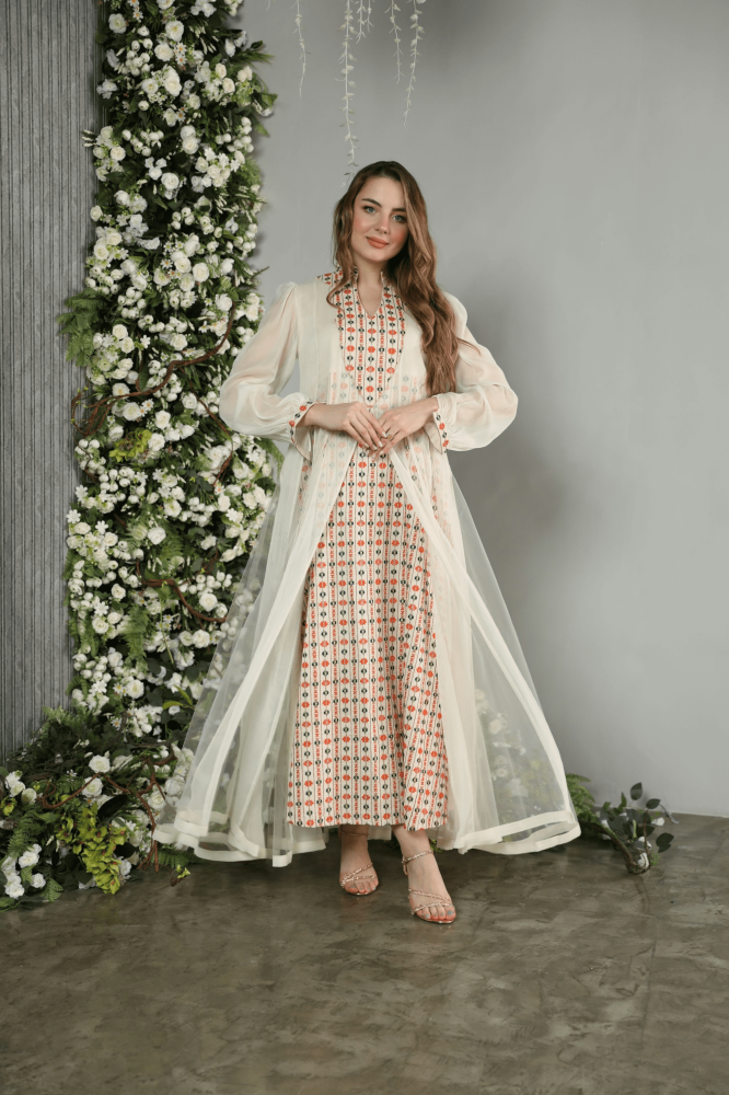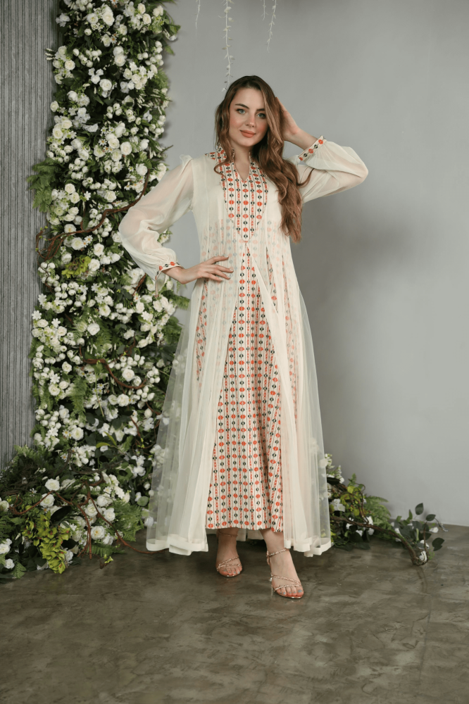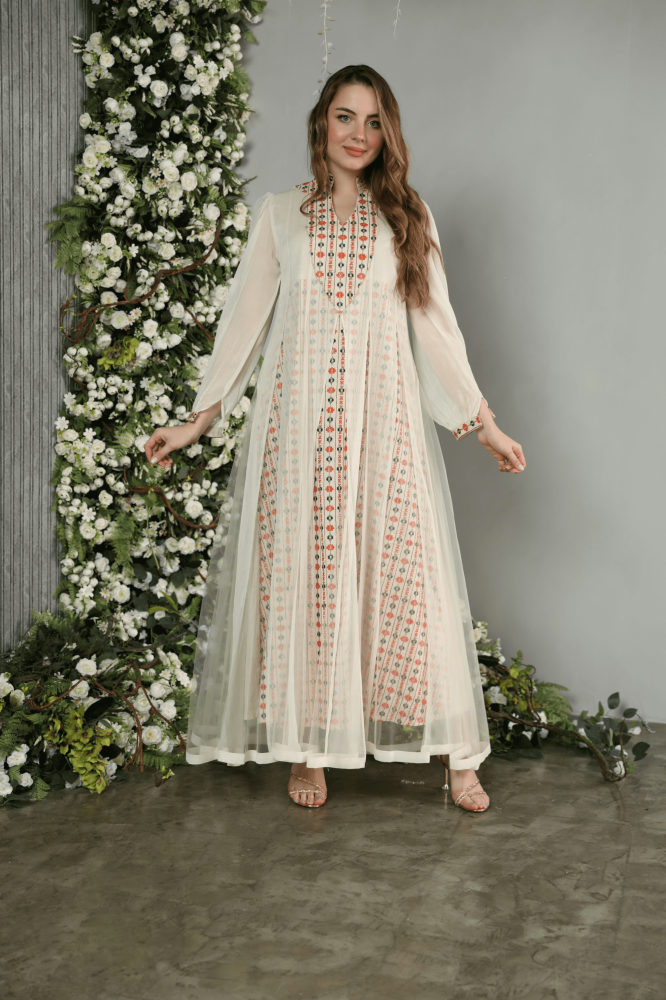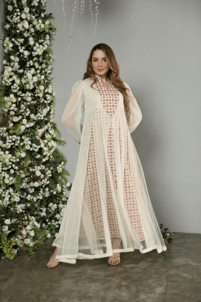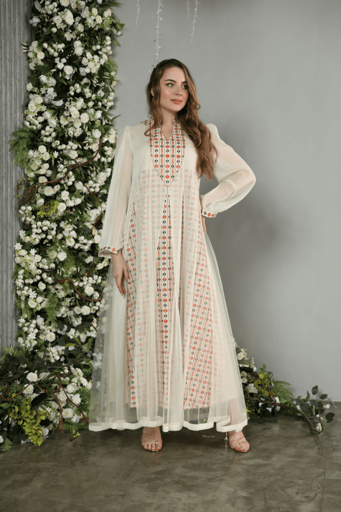 جلابيه مناسبات فخمه بمكس خامات فاخره شيفون بيج و تول ولينن مقلم باللون الاورنج مشغول تطريز بقصه كلوش لاطلاله راقيه