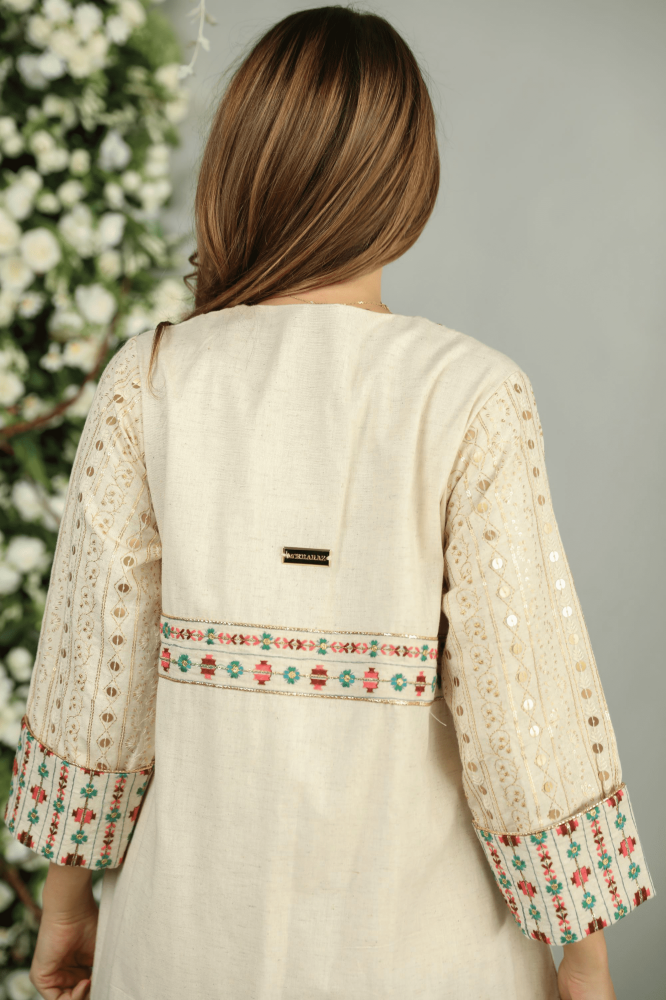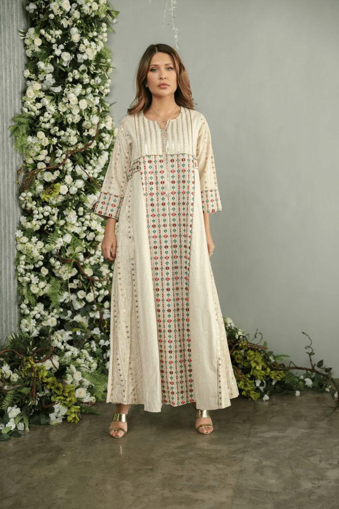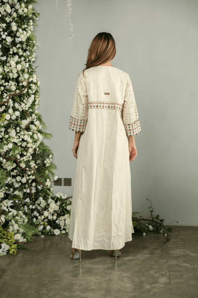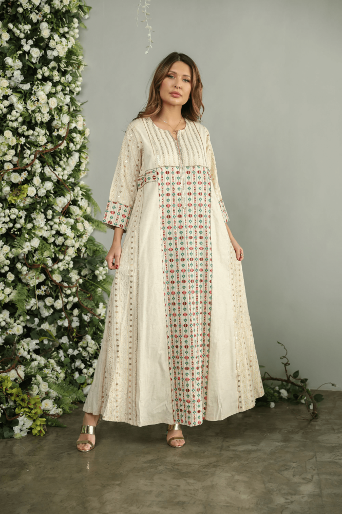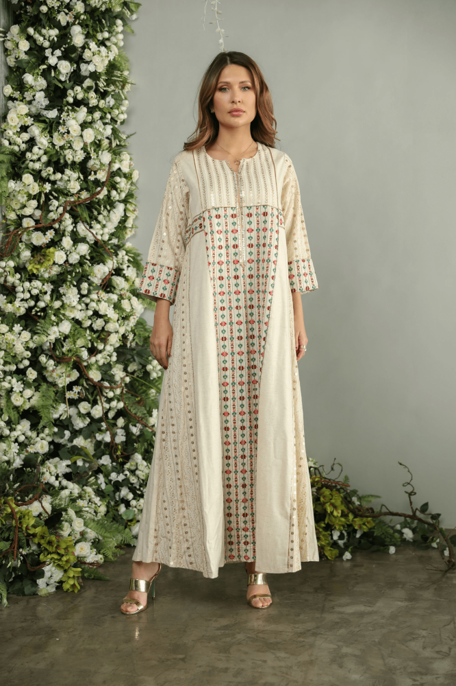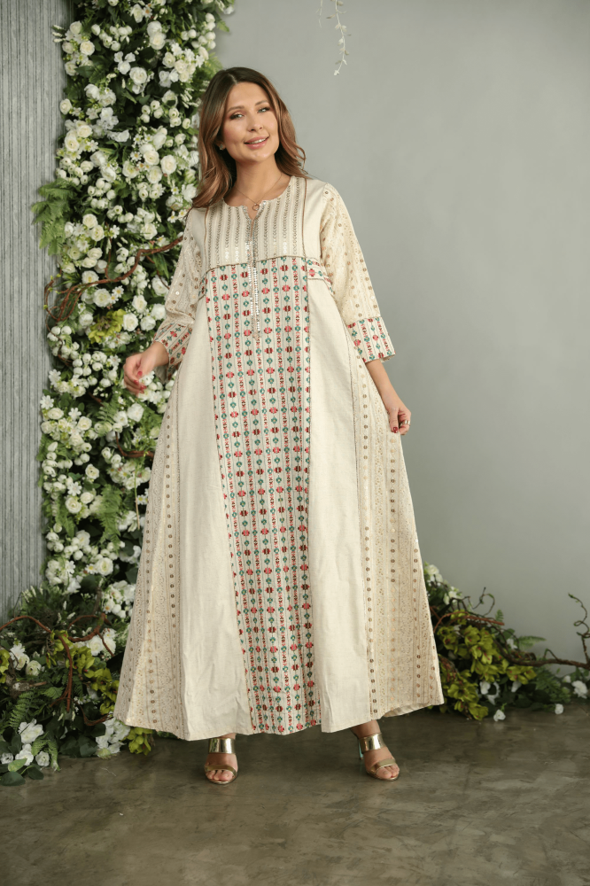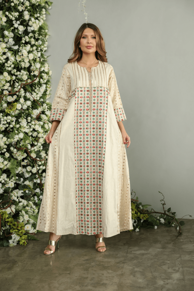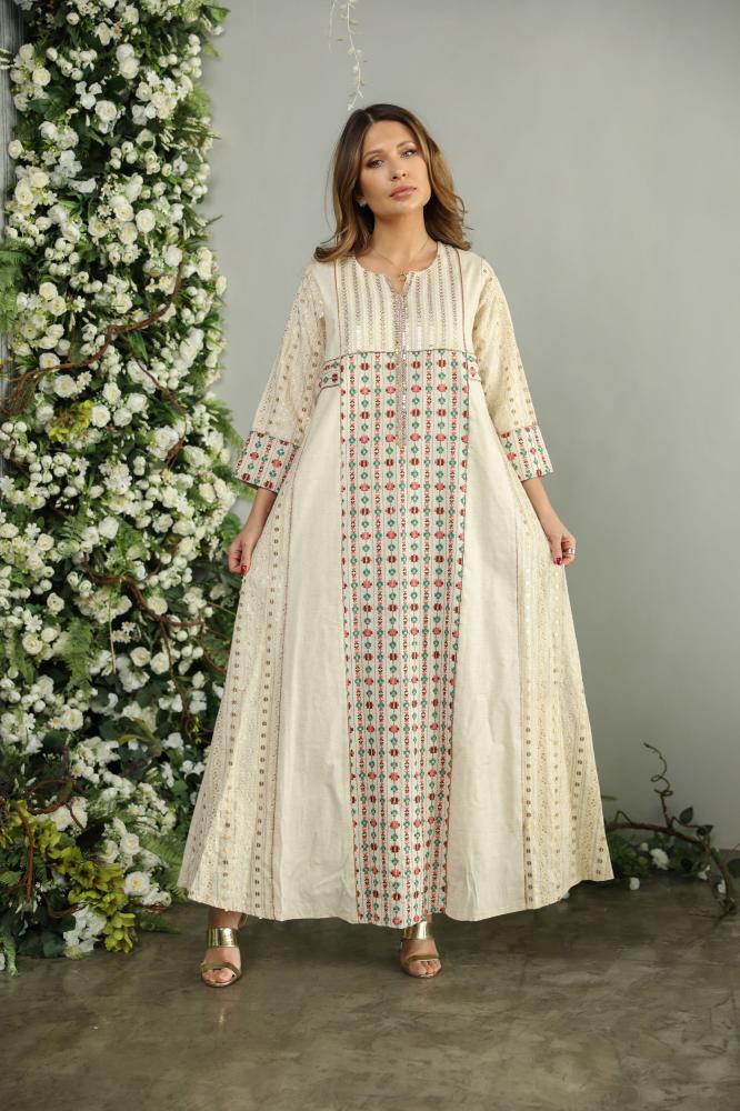 جلابيه مناسبات لإطلاله رسمية بخامة بيور لينن مشغول شك وتطريز مقلم ناعم وراقي بقصه كلوش