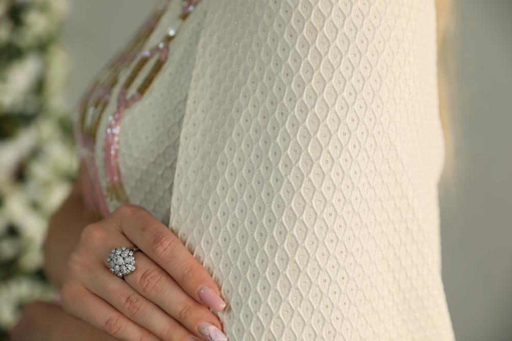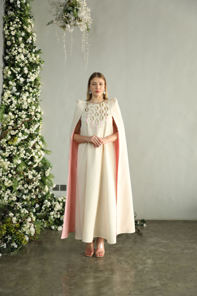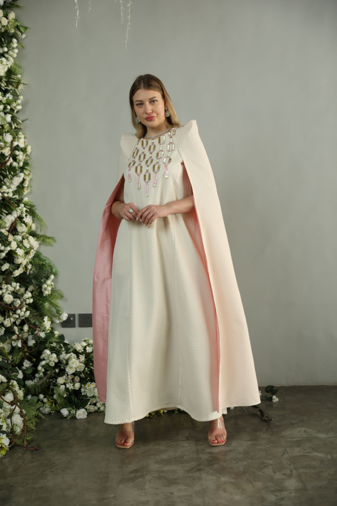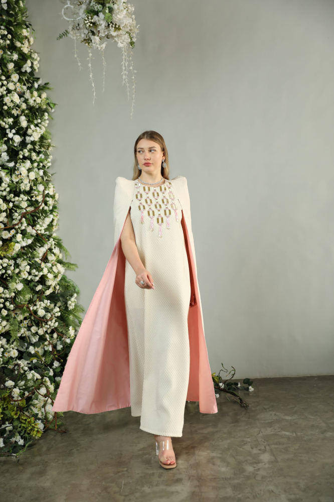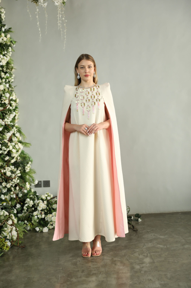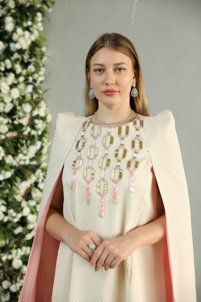 دريس بتصميم كيب لاطلاله راقيه بخامة جاكار فاخر مشغول شك يدوي ثلاثي الابعاد ناعم وراقي باللون البيج والوردي