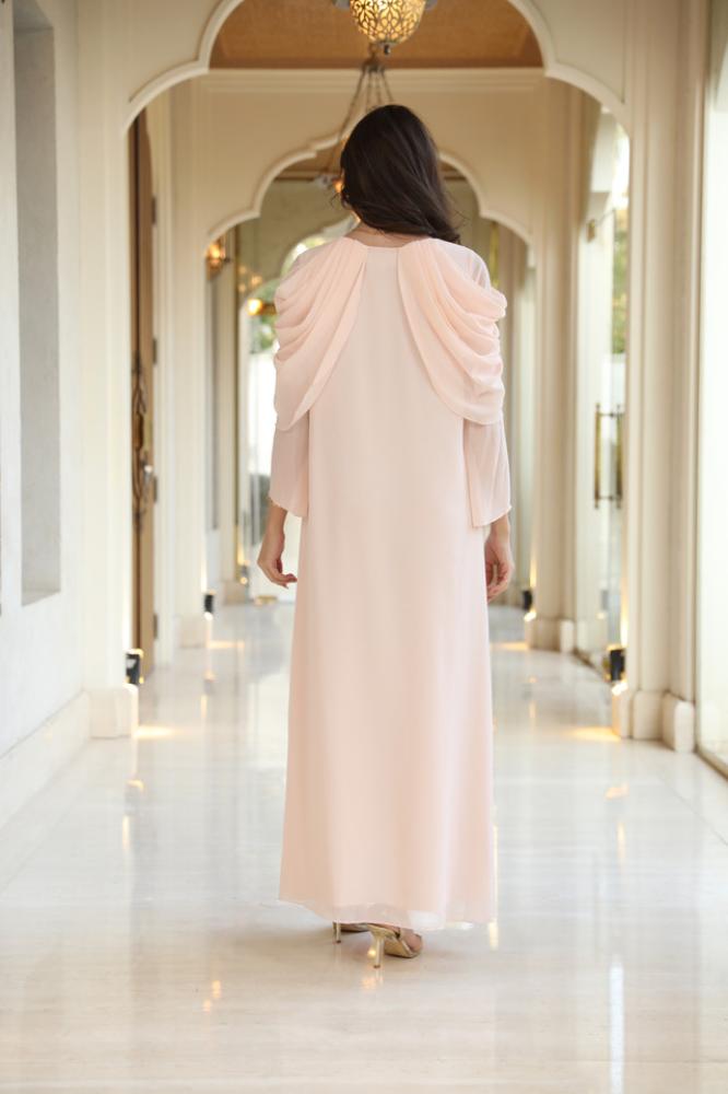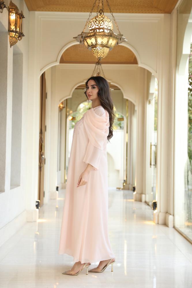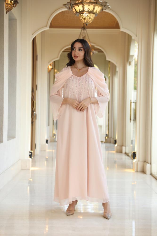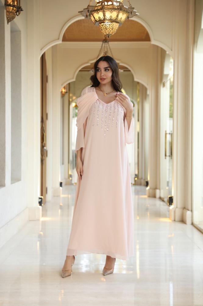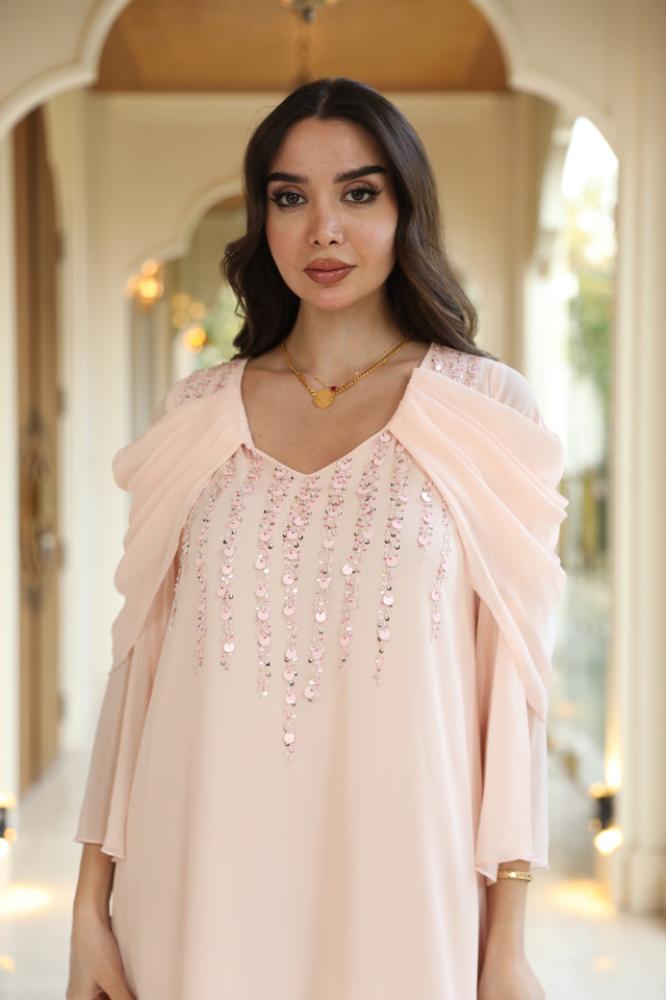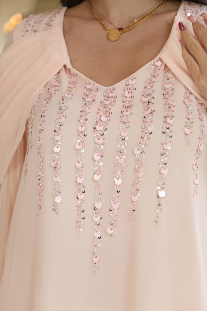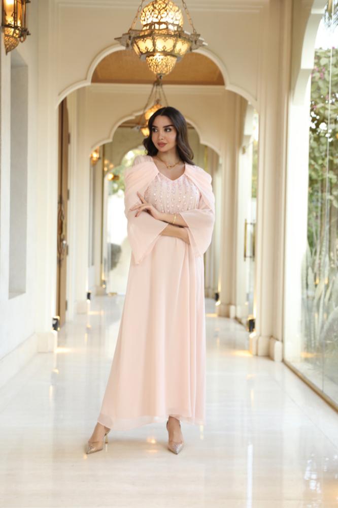 دريس شيفون بينك لاطلاله راقيه مشغول شك يدوي ناعم وتصميم رافلز على الأكمام