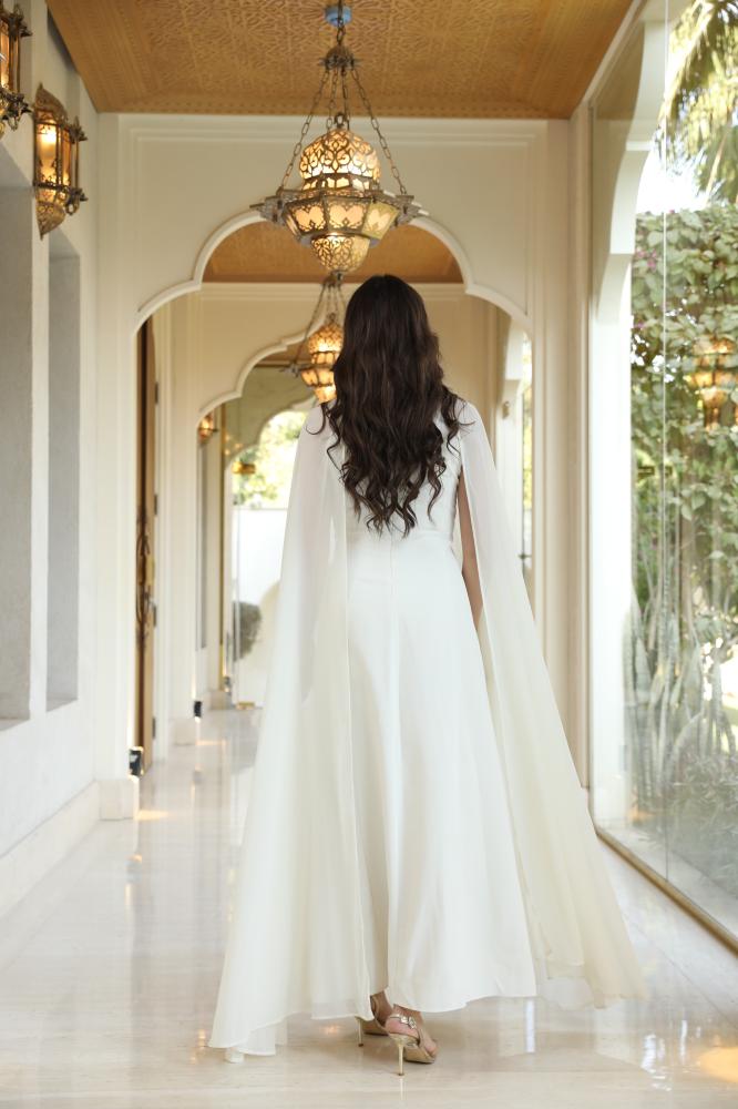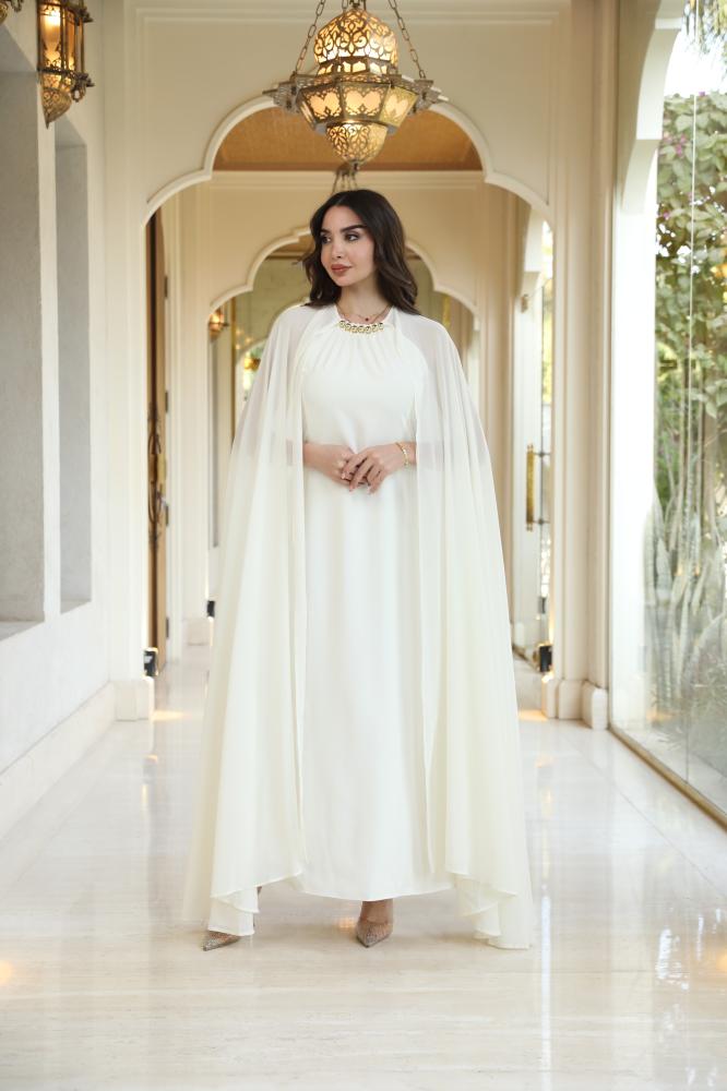 دريس لاطلاله راقيه بتصميم كيب بمكس خامات فاخره كريب ناعم وشيفون مشغول شك يدوي على الياقه بألوان رسميه بيج و ذهبي