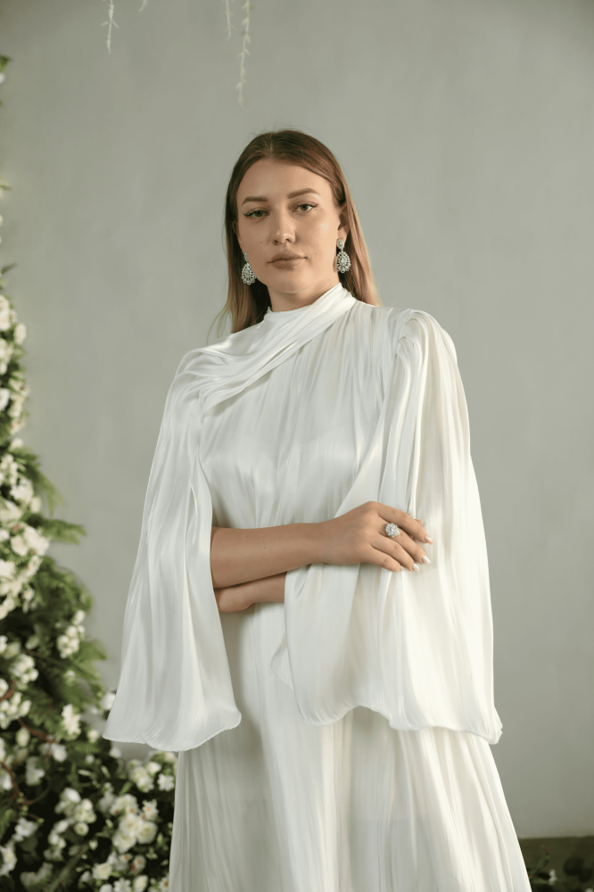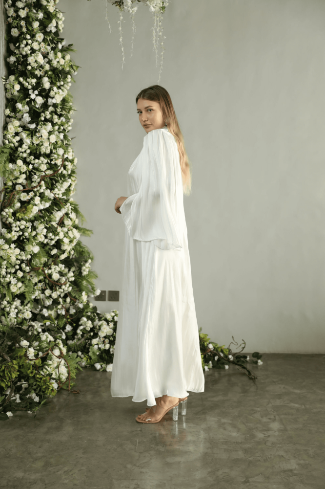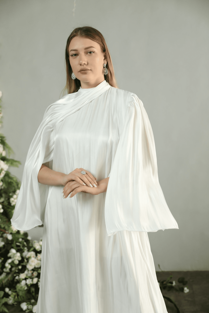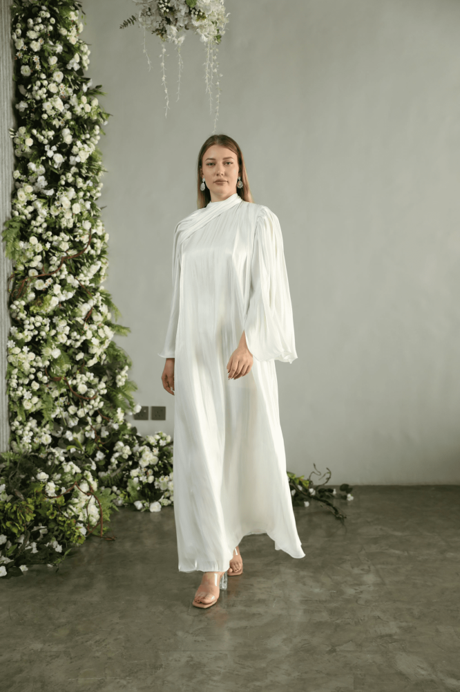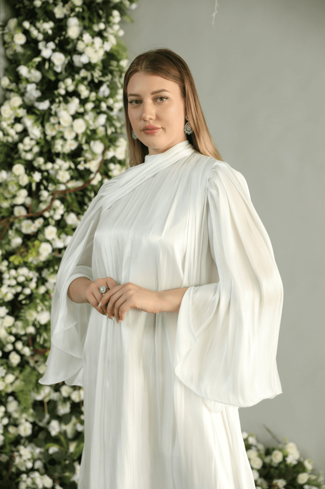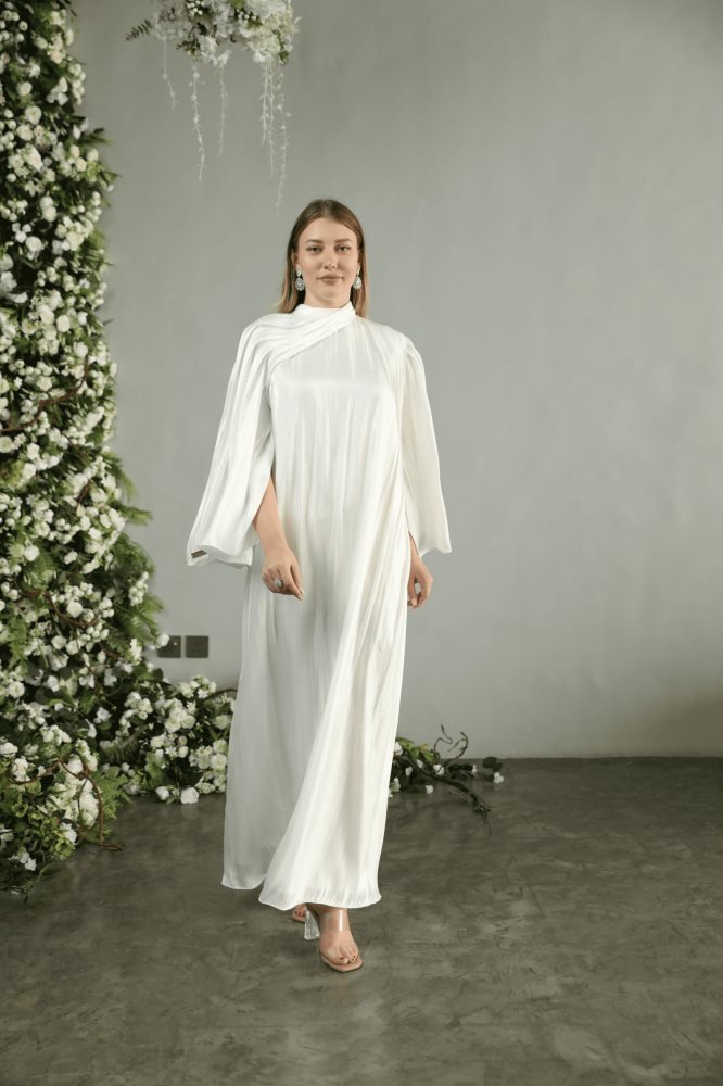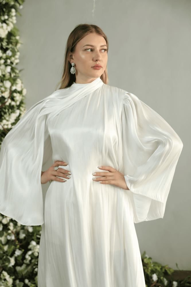 ريفيرا دريس تصميم كلاسيك لاطلاله راقيه بخامة اورقنزا ناعم وراقي بقصة كلووش فلووي باللون الاوف وايت
