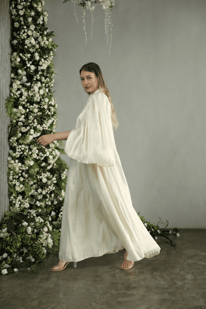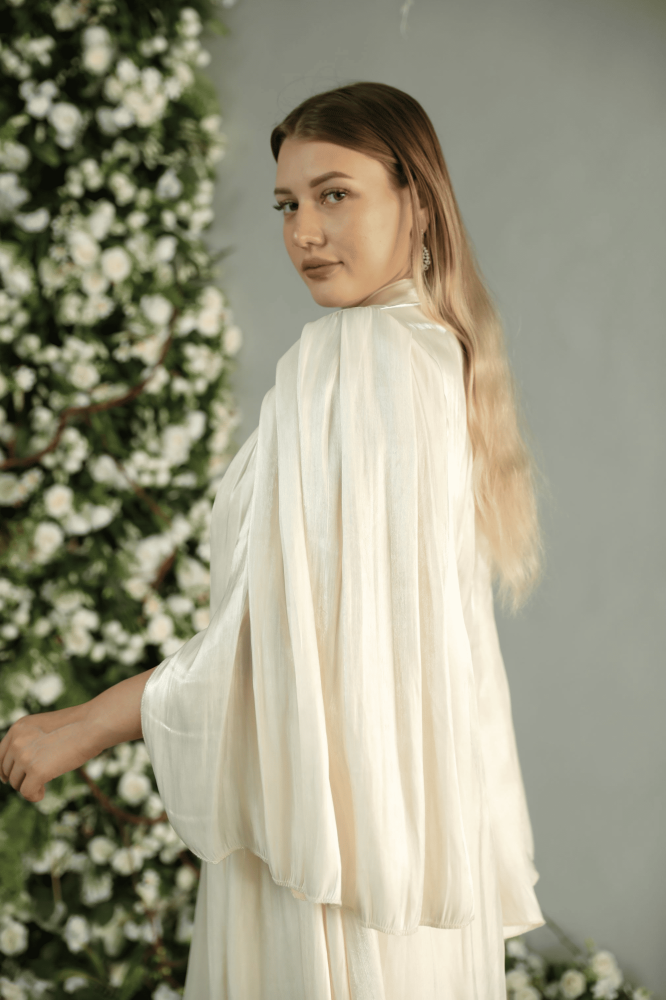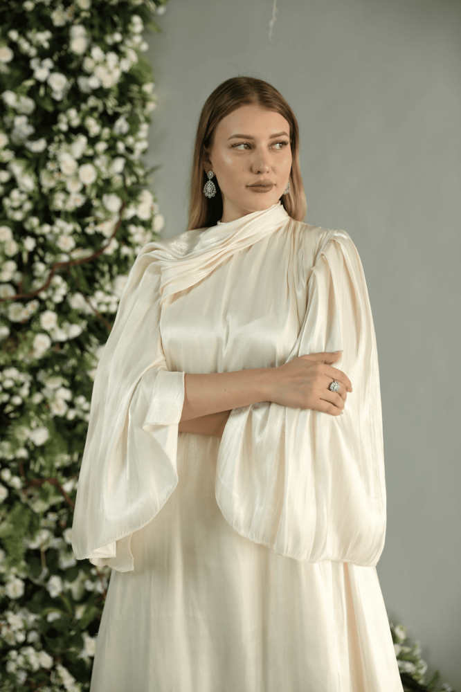 ريفيرا دريس تصميم كلاسيك لاطلاله راقيه بخامة اورقنزا ناعم وراقي بقصة كلووش فلووي بلون الؤلؤ