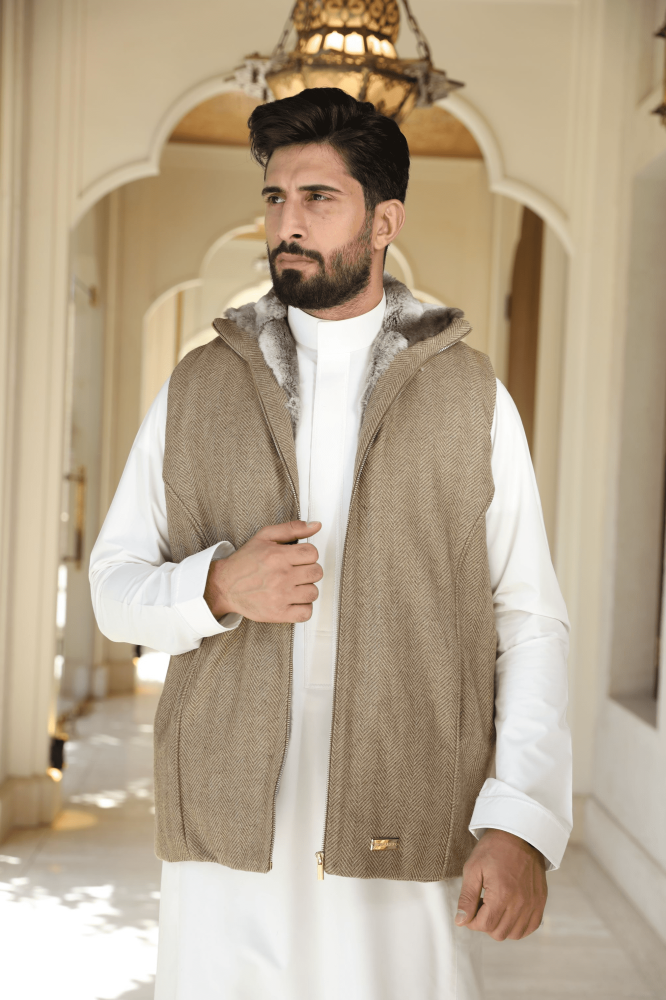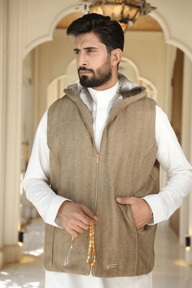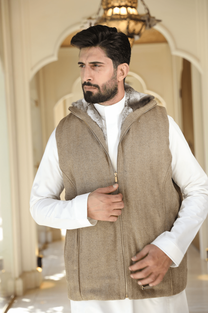 سديري رسمية بخامة الكشمير الفاخر بتصميم ZIC ZAC وبلون أسود رمادي مبطن بفرو أرنب الريكس الحقيقي ستايل شانشيلا ناعم ودافئ وسميك