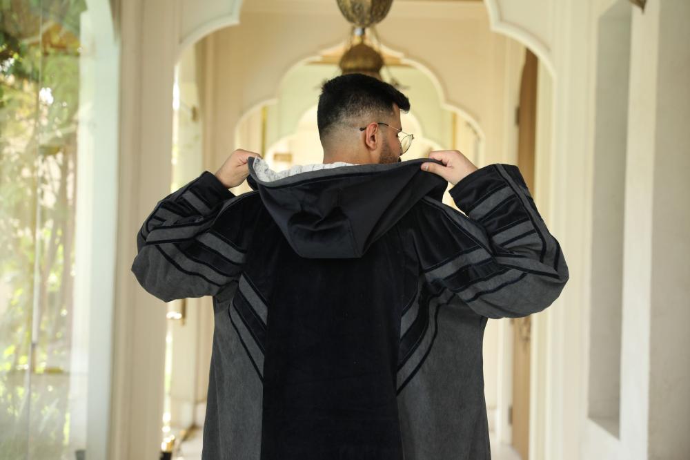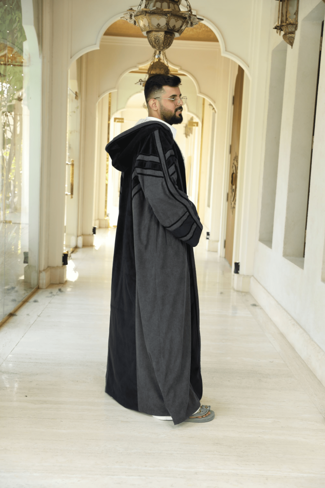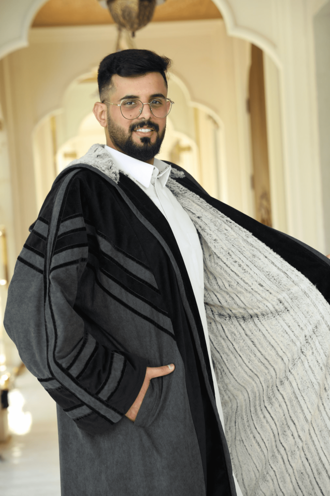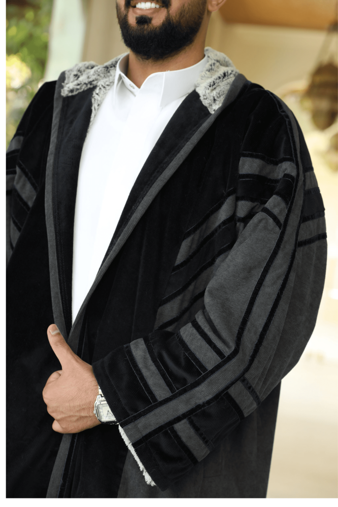 فروه رجالي رسمية شاموا رمادي مقلم باللون الكحلي ومبطن فرو أرنب ناعم ودافئ وخفيف