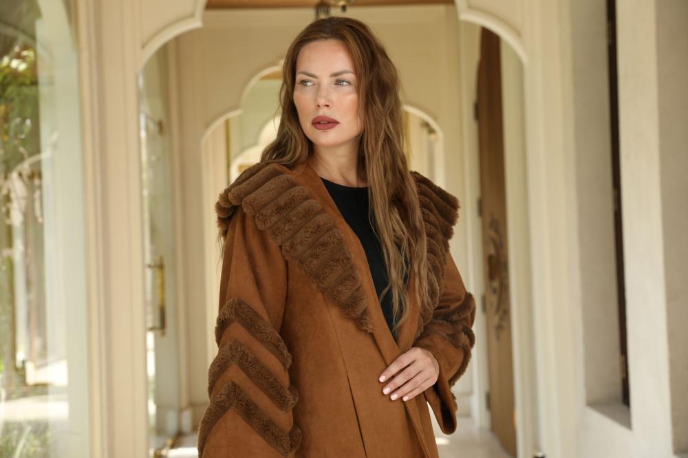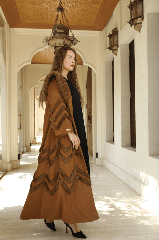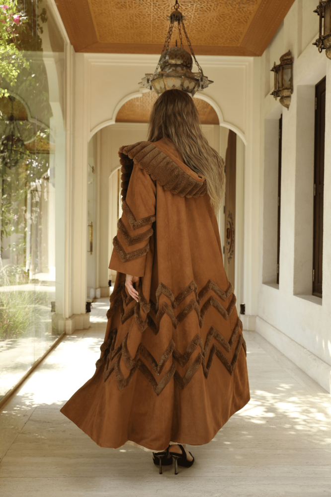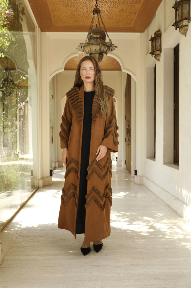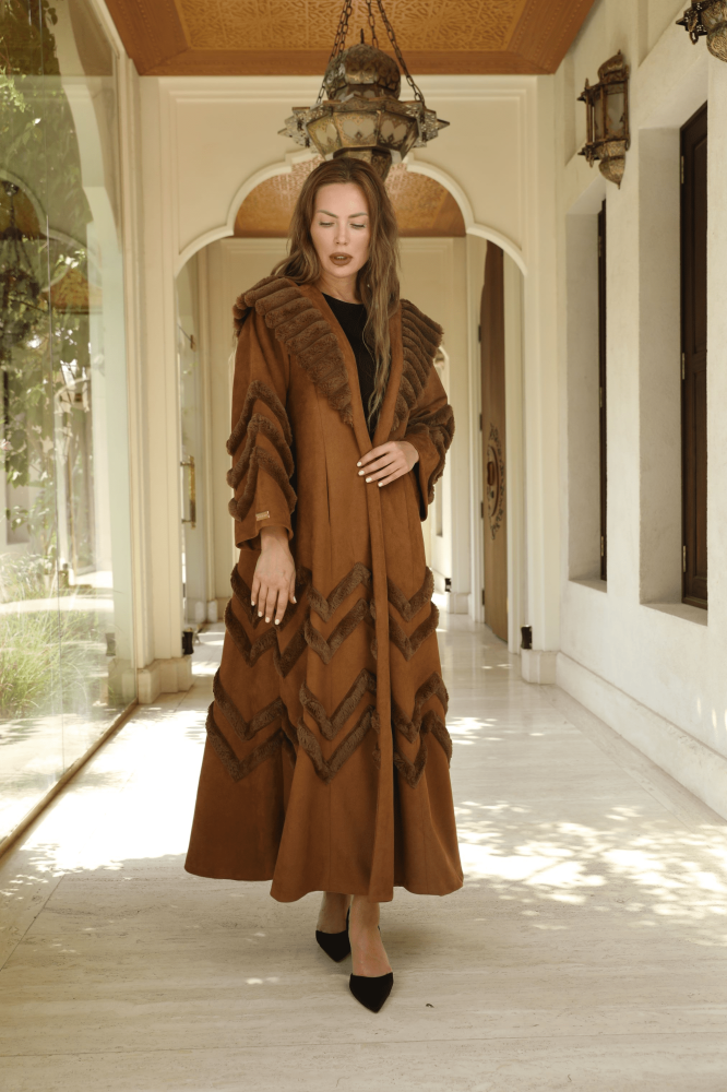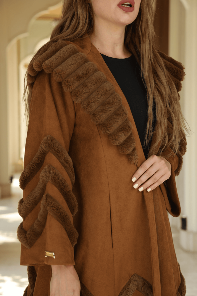 فروه-عبايه ستايل بتصميم عصري بخامة شاموا فاخره واضافات فرو أرنب بتصميم ZIC ZAC -اللون جملي