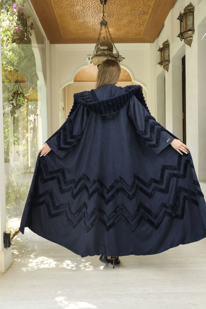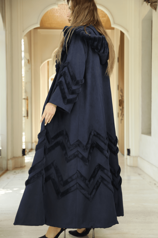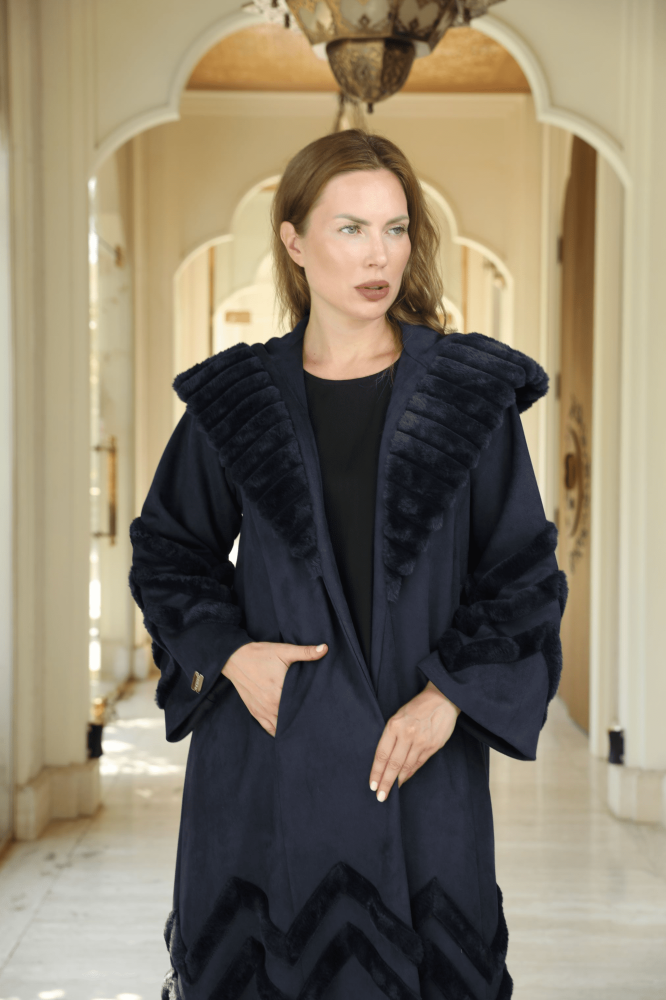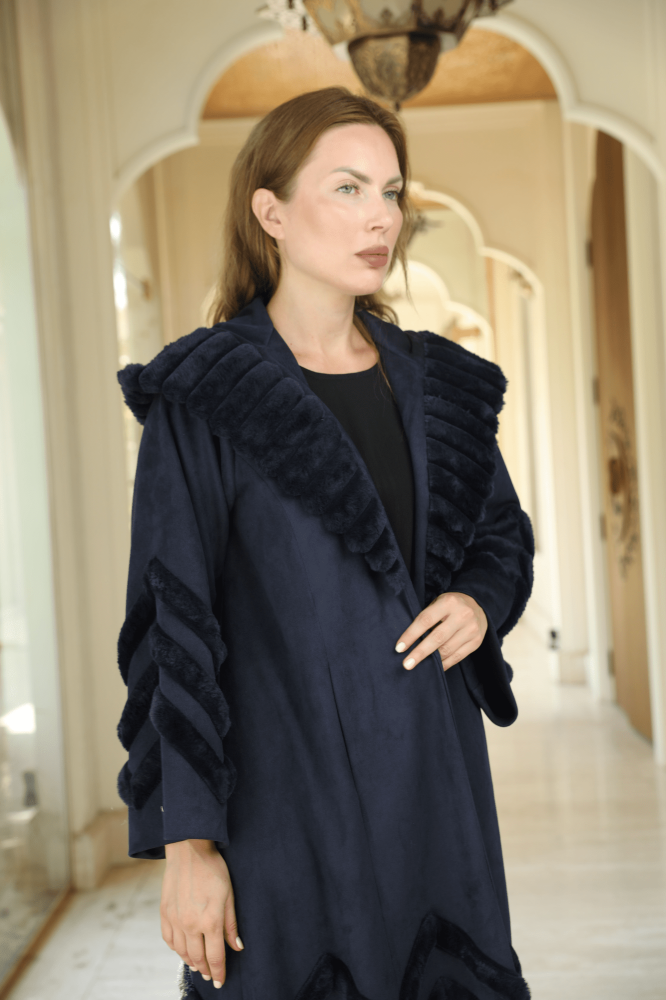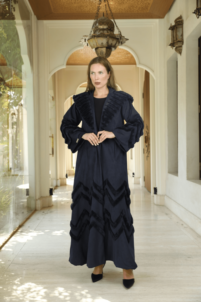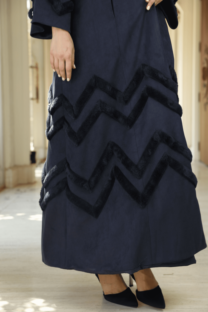 فروه - عبايه ستايل بتصميم عصري راقي بخامة الشاموا الفاخرة وباضافات فرو أرنب بتصميم ZIC ZAC -اللون كحلي