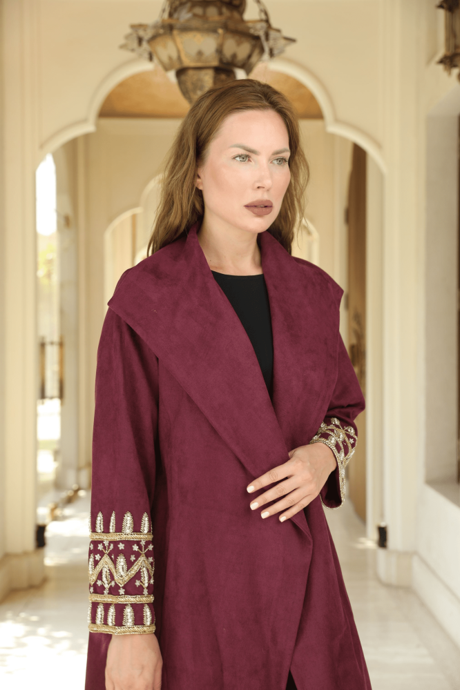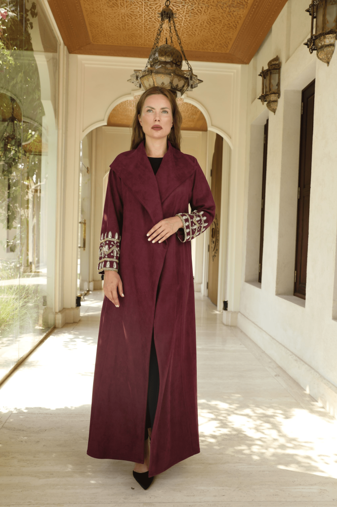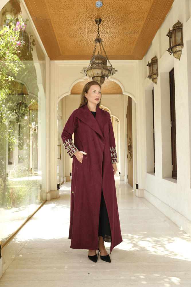 فروه/ عبايه ستايل بخامه شاموا مشغول شك يدوي راقي -اللون عنابي