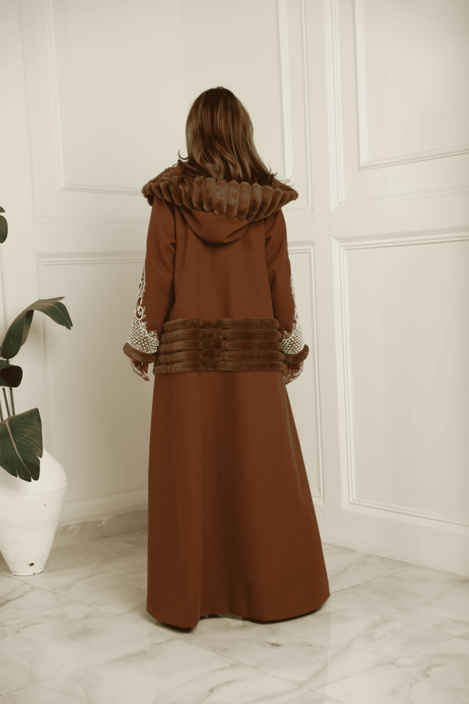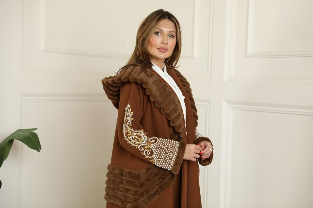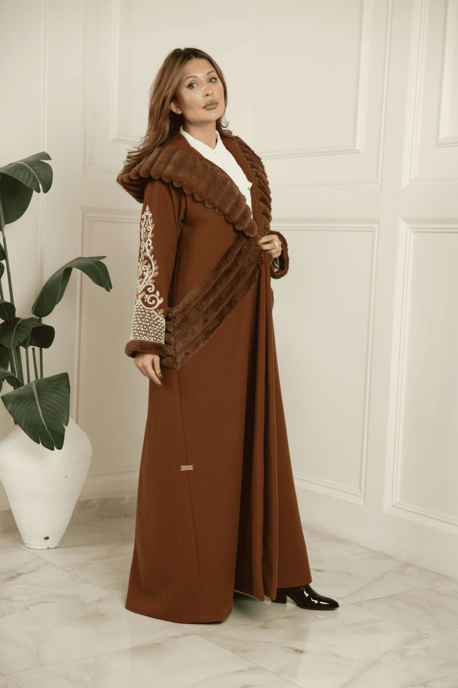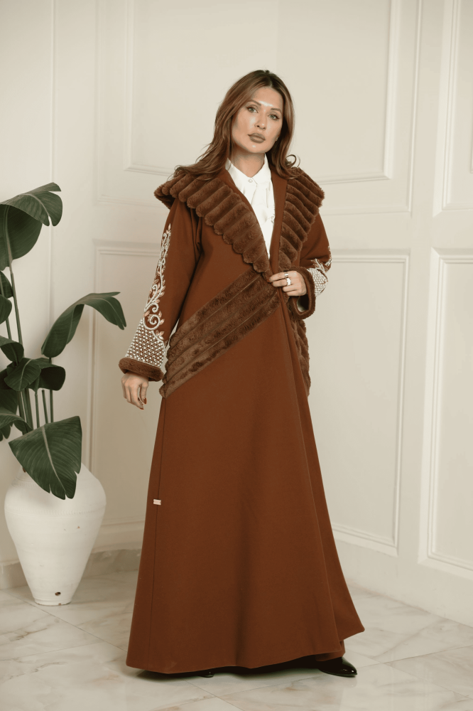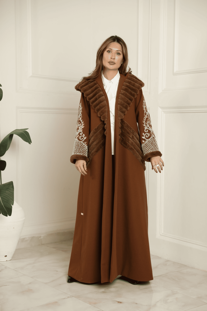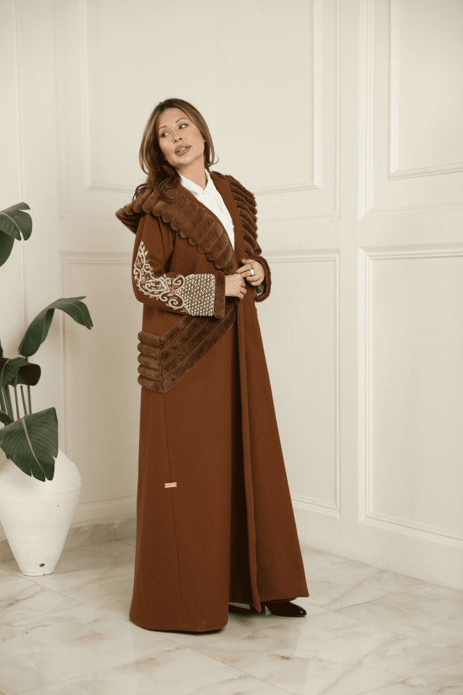 فروه / عبايه ستايل تصميم عصري بخامة جوخ فاخر مشغول شك يدوي راقي وباضافات فرو أرنب ناعم ودافئ - اللون جملي