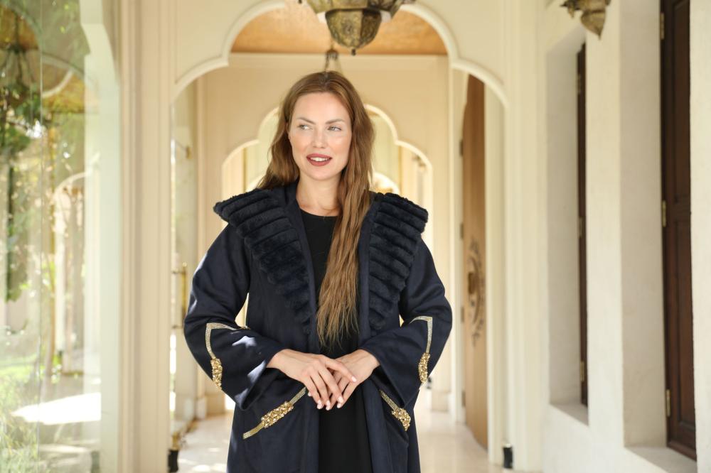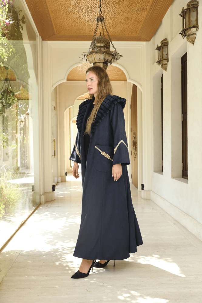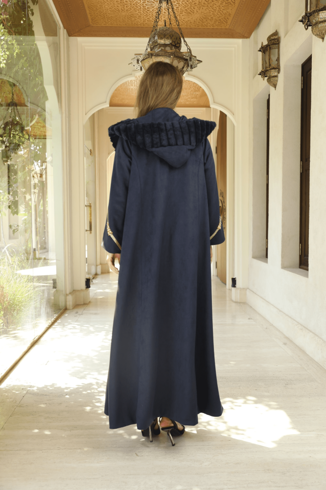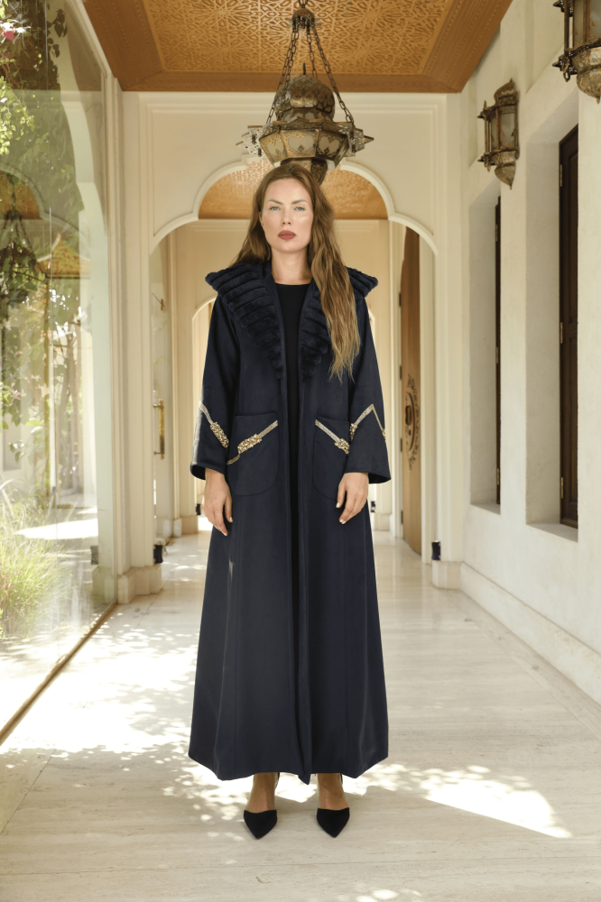 فروه / عبايه ستايل تصميم عصري بخامة شاموا فاخره مشغول شك يدوي ذهبي راقي -اللون كحلي