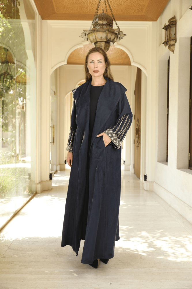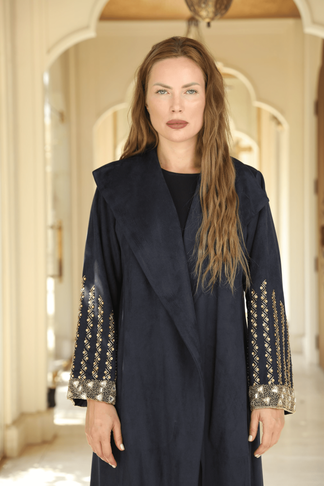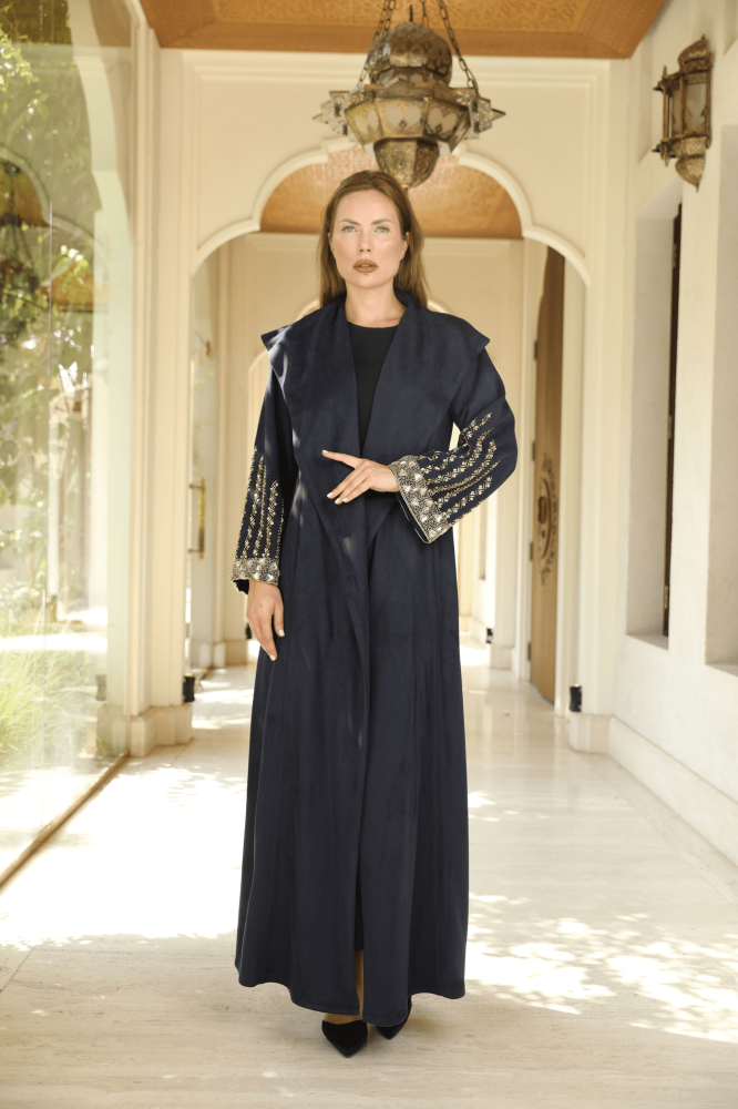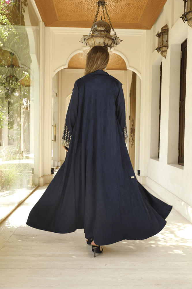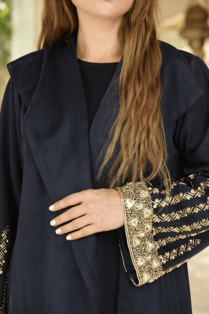 فروه// عبايه ستايل تصميم عصري بخامة شاموا مشغول كرستال وشك يدوي ذهبي راقي - اللون كحلي