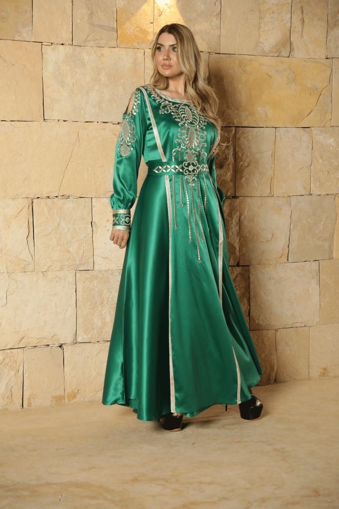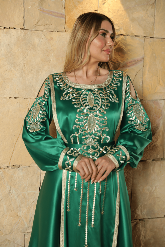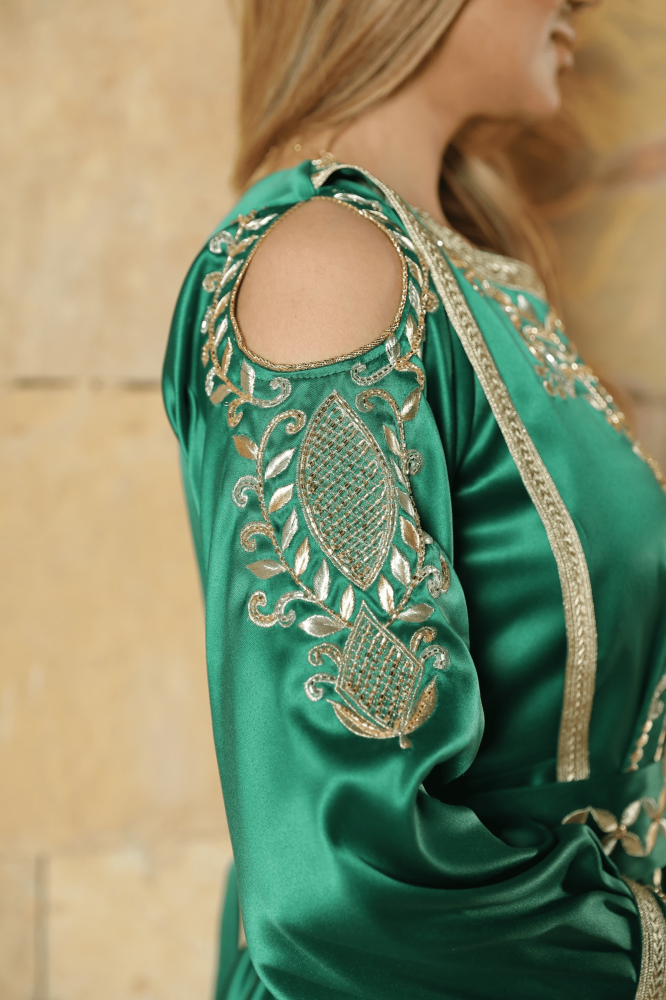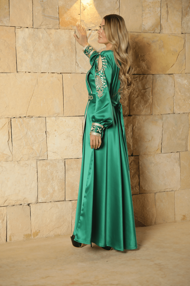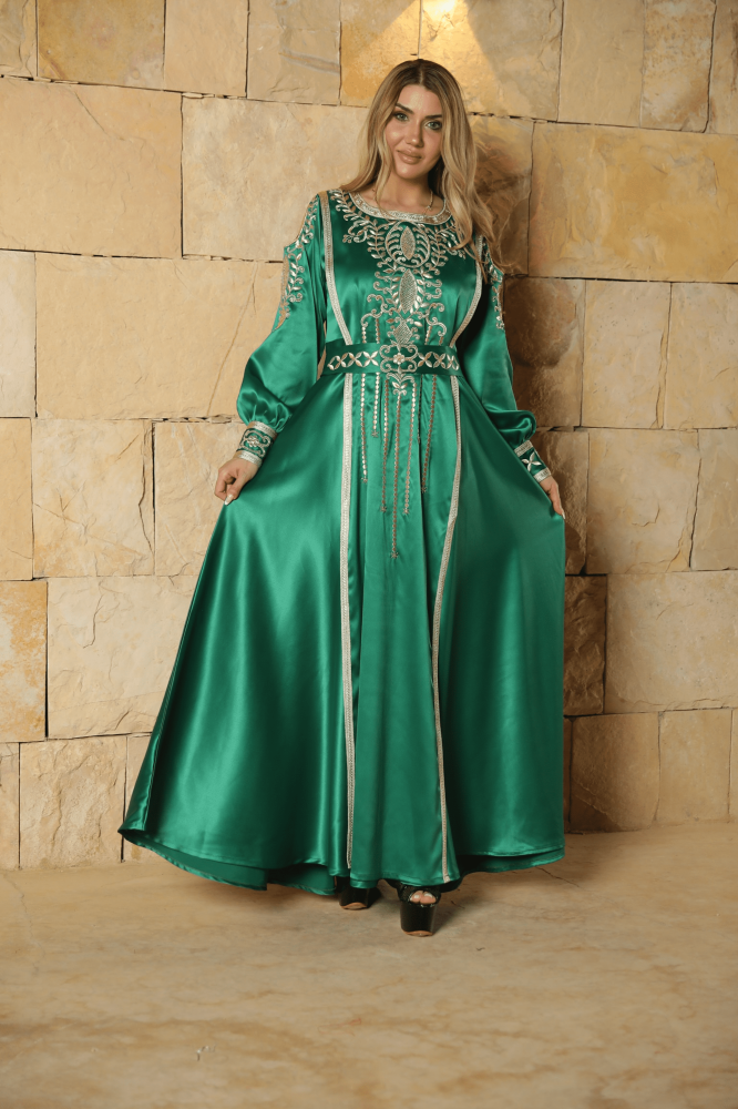 قفطان مغربي حرير اخضر فخم صمم يدويا بعناية ودقة مع إضافات شك وتطريز فاخر، قفطان ذو تصميم ملكي جميل و مميز . مناسبة لداخل البيت وخارجه مصنوع من حرير أصلي ذو جودة عالية لمظهر فخم ملائم لكل المناسبات و الاستعمال اليومي أيضا.