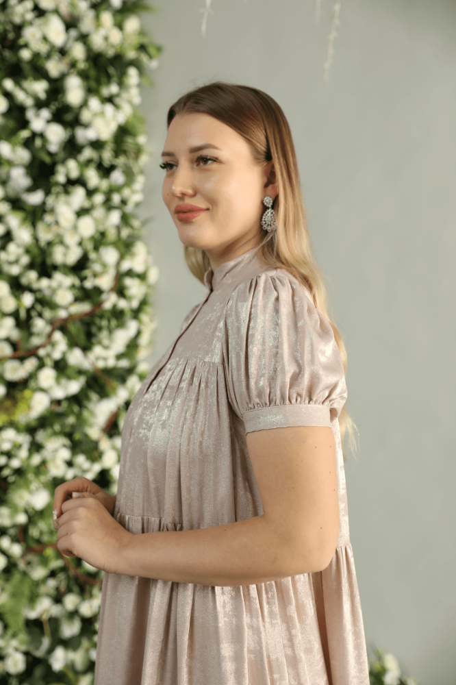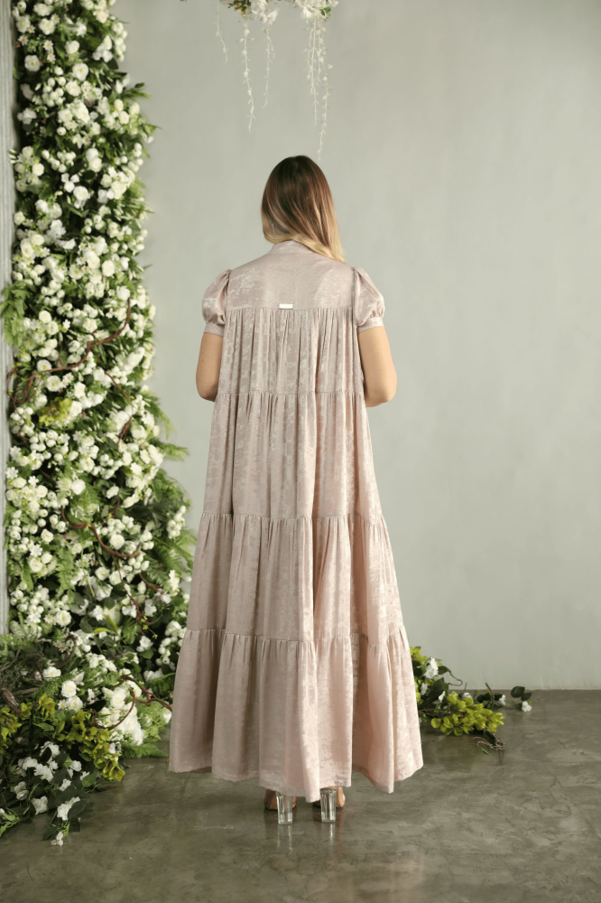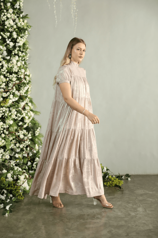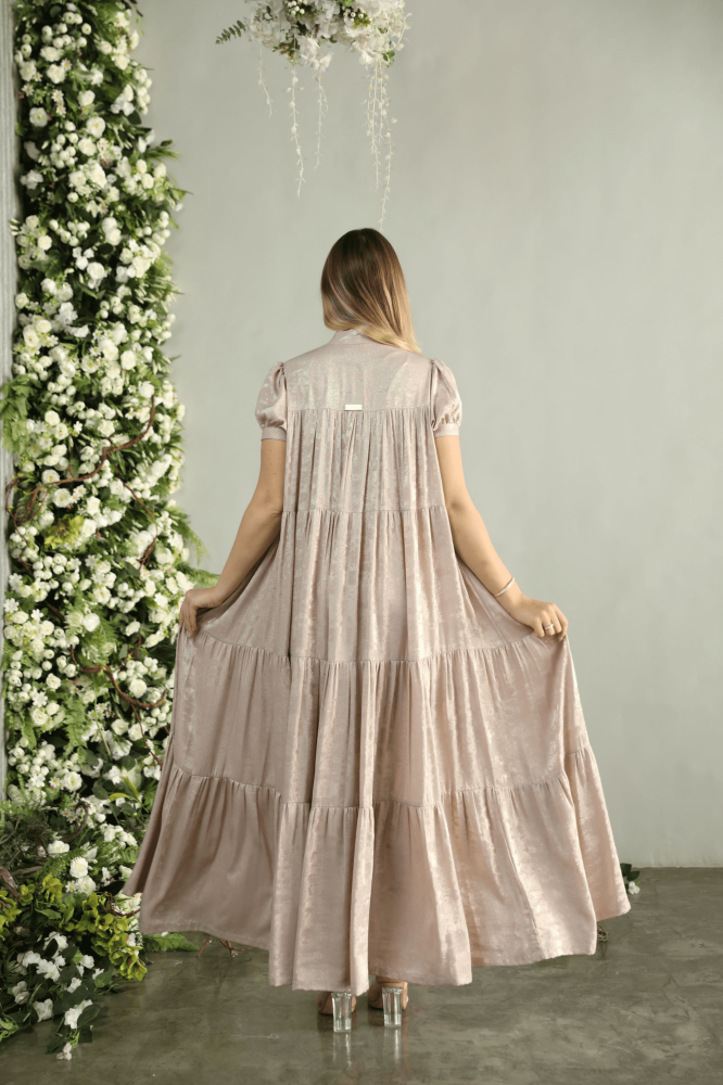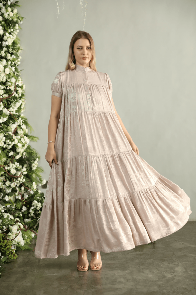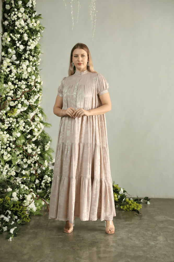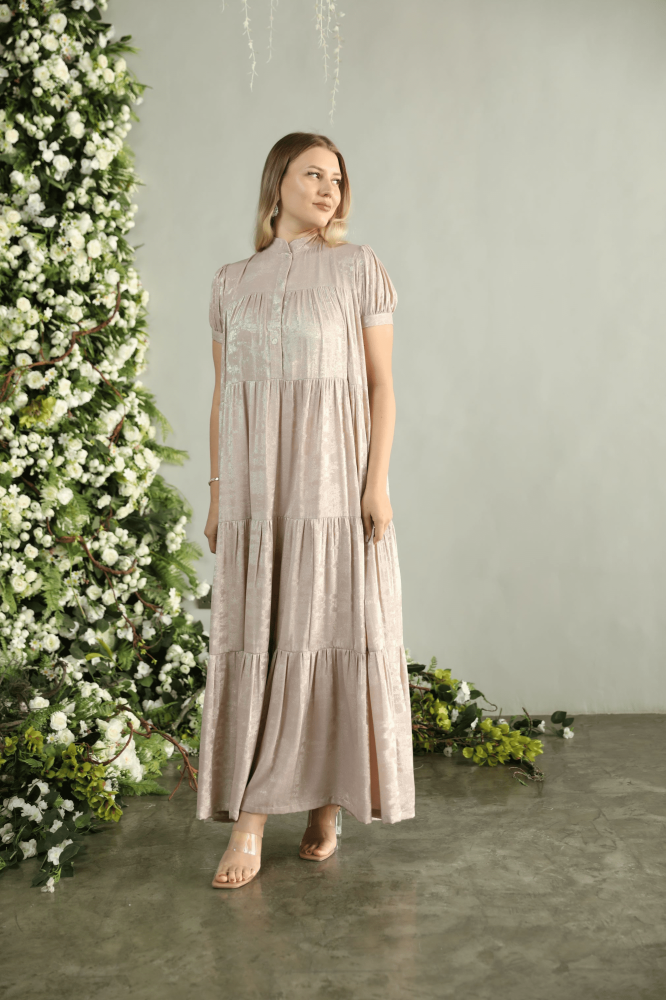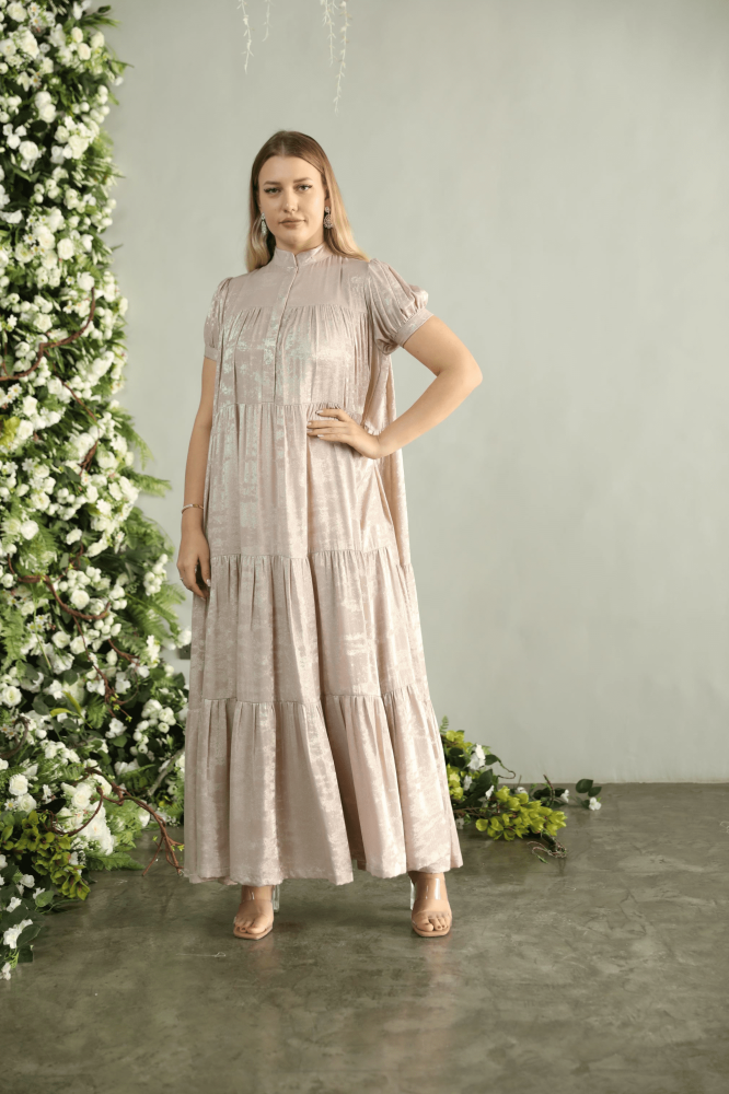 جلابيه لاطلاله جذابه بخامة كريب حرير ميتالك فاخر وناعم بتصميم طبقات فلوي وباللون النوود